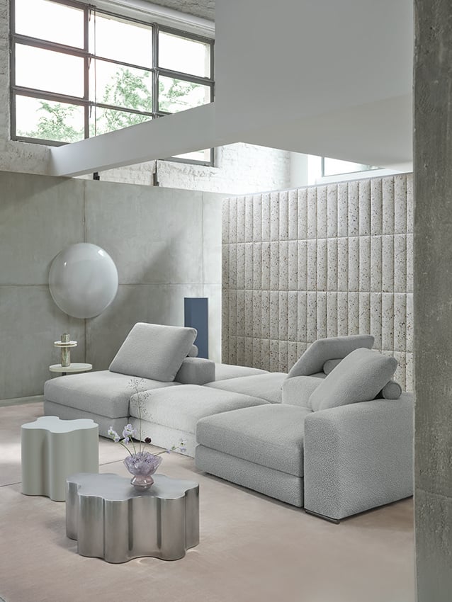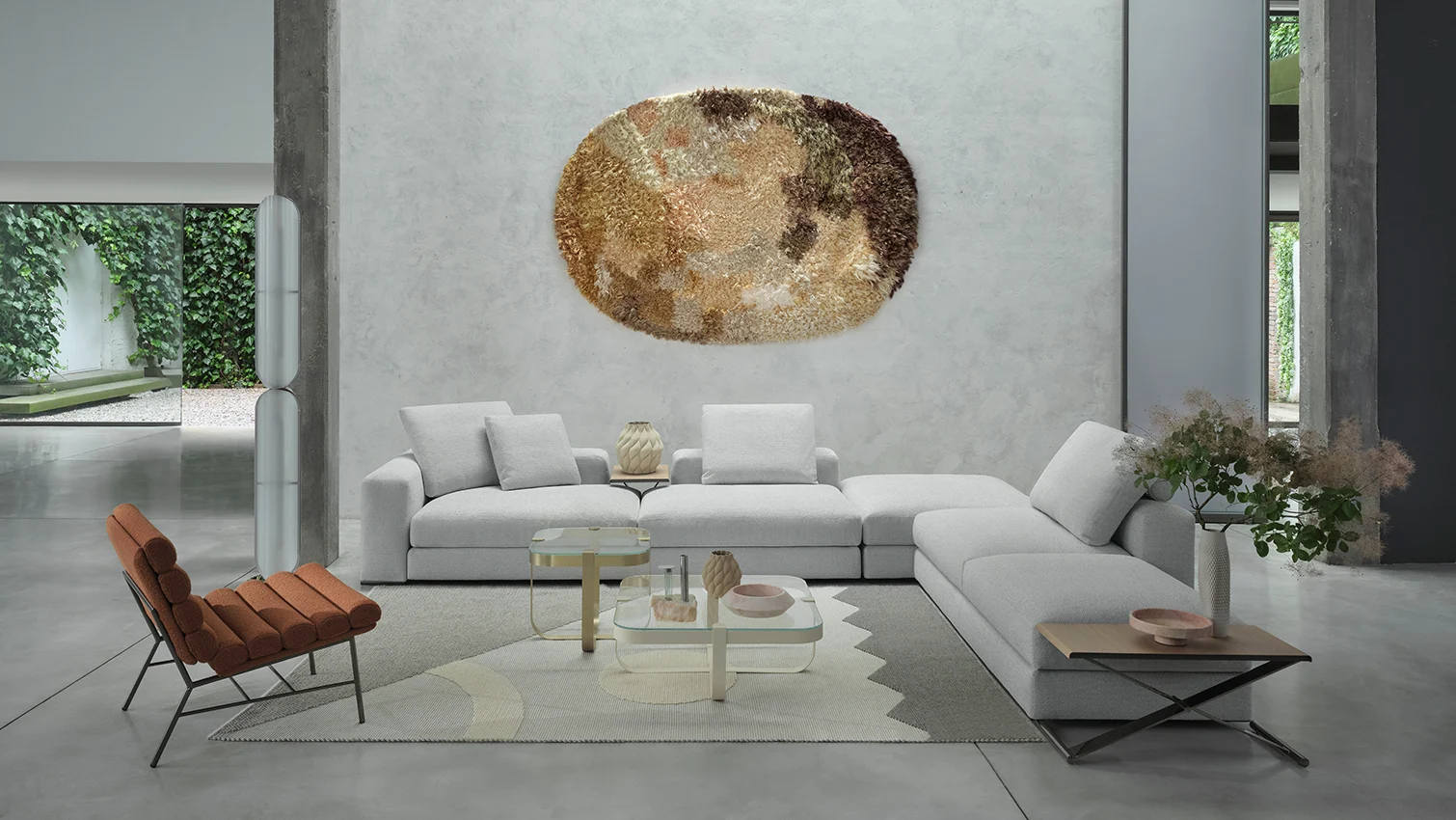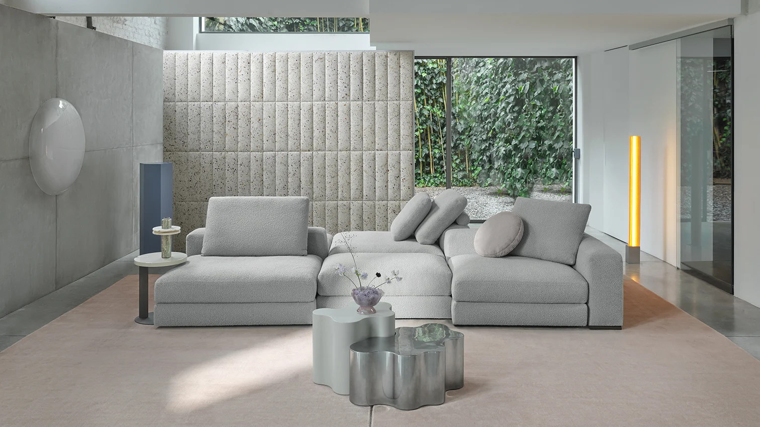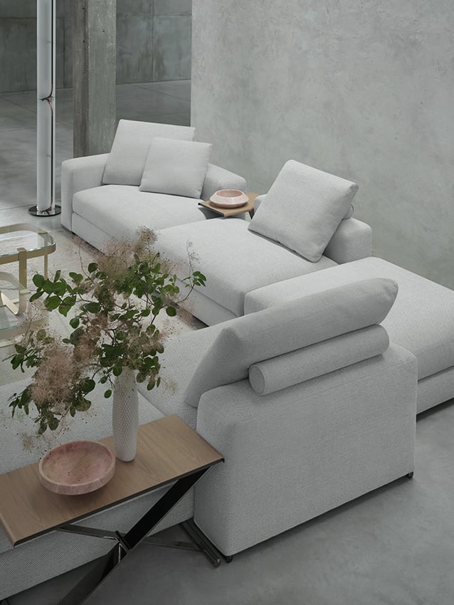 Ananta Class is an informal and versatile modular range that allows endless combinations of the independent backrests and bases available in 80, 120, 160, 200, and 240 cm lengths. The collection, whose very name evokes the idea of infinity, is based on the idea of simplified construction: free from the constraints of armrests and backrests, the seating can be arranged to suit individual needs. It is completed with a side table available in two sizes. The black chrome rest holds up a tabletop available either in walnut veneer or regenerated leather. The line offers a new, individualistic, modern way of shaping things to fit people’s needs. Fully removable covers.