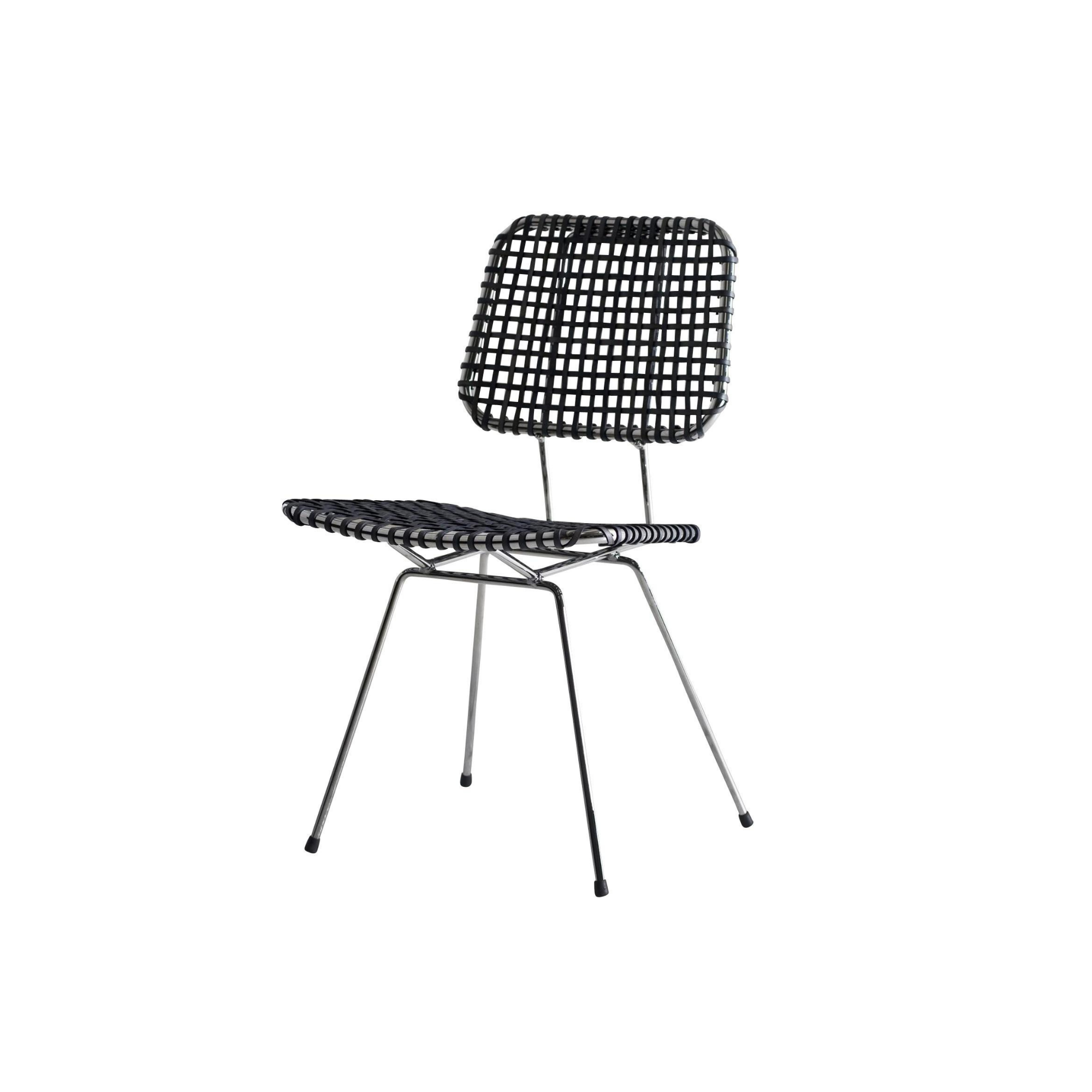 The Brick 23 chair without armrests has a structure in polished chromed steel rod. Light lines and low thicknesses are emphasised by the grey parchment weave of the seat and backrest.