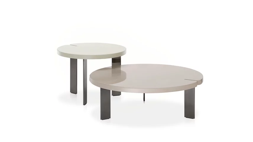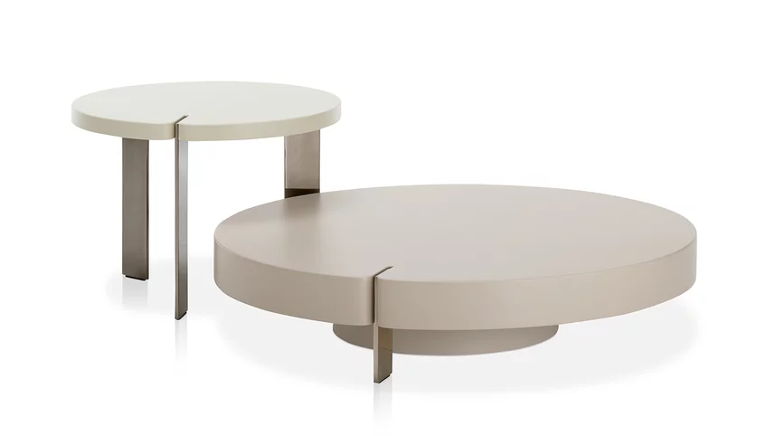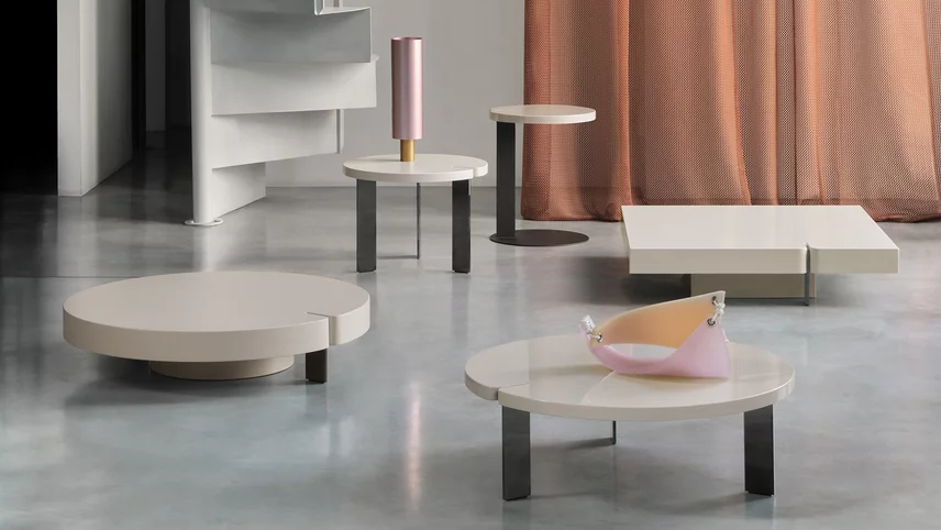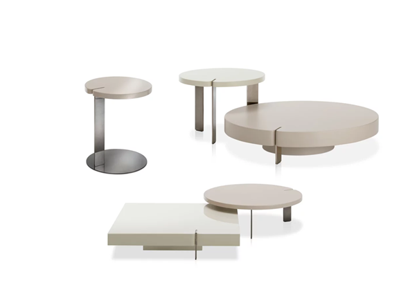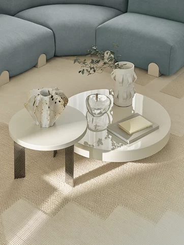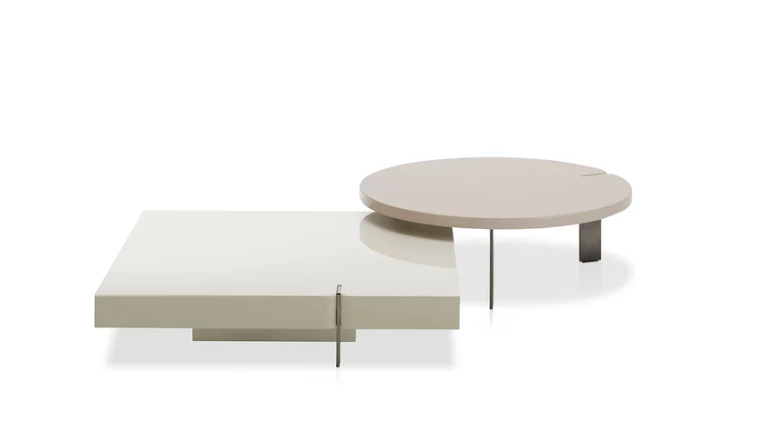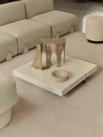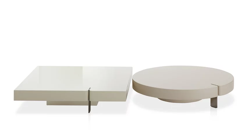 The new Butter coffee table evokes the blade that sinks into butter. The square or round forms, available in several dimensions and heights, allow for volumes to design the space, by playing with the shades of the glossy or matt finishes. The collection also offers a practical table that can be moved, if necessary, to be placed near a seat element, to be used as a surface to place a book or an object. Produced in glossy or matt lacquered mdf, the elements are available in ivory and sand.