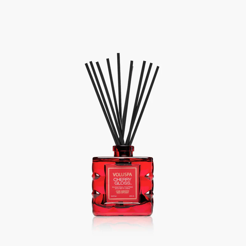 Premium sculpted, bold red glass with a modern cubed silhouette, including 10 high-absorbency reed sticks packaged in a decorative box.