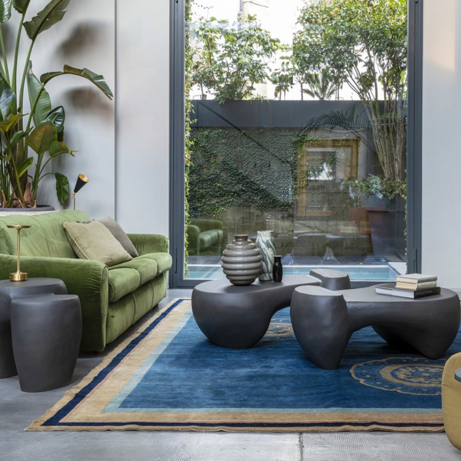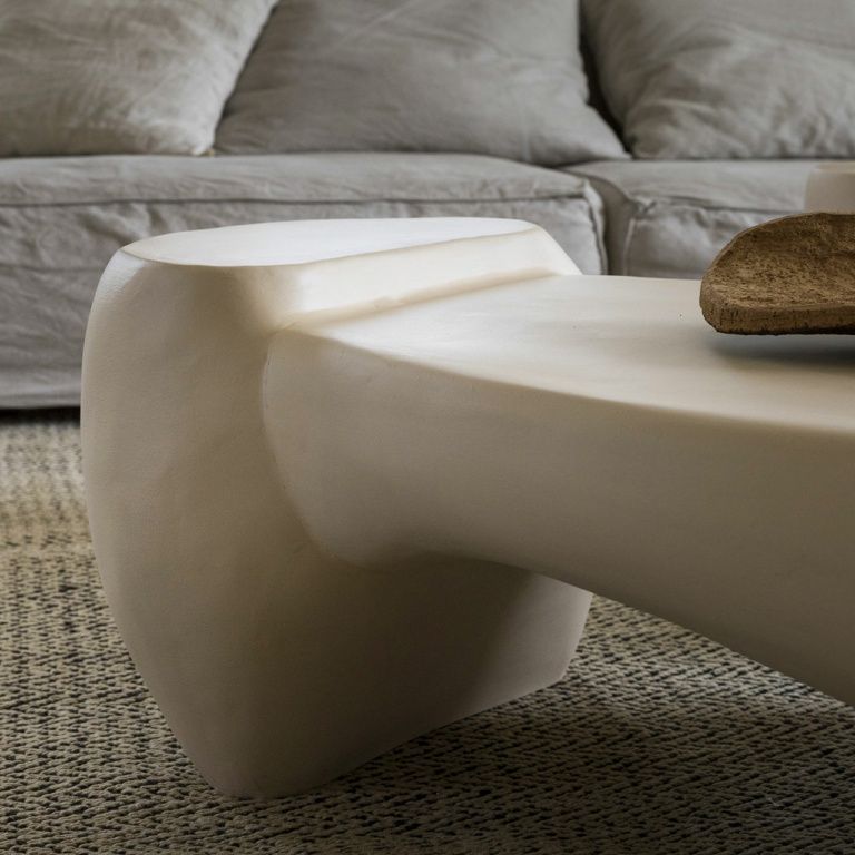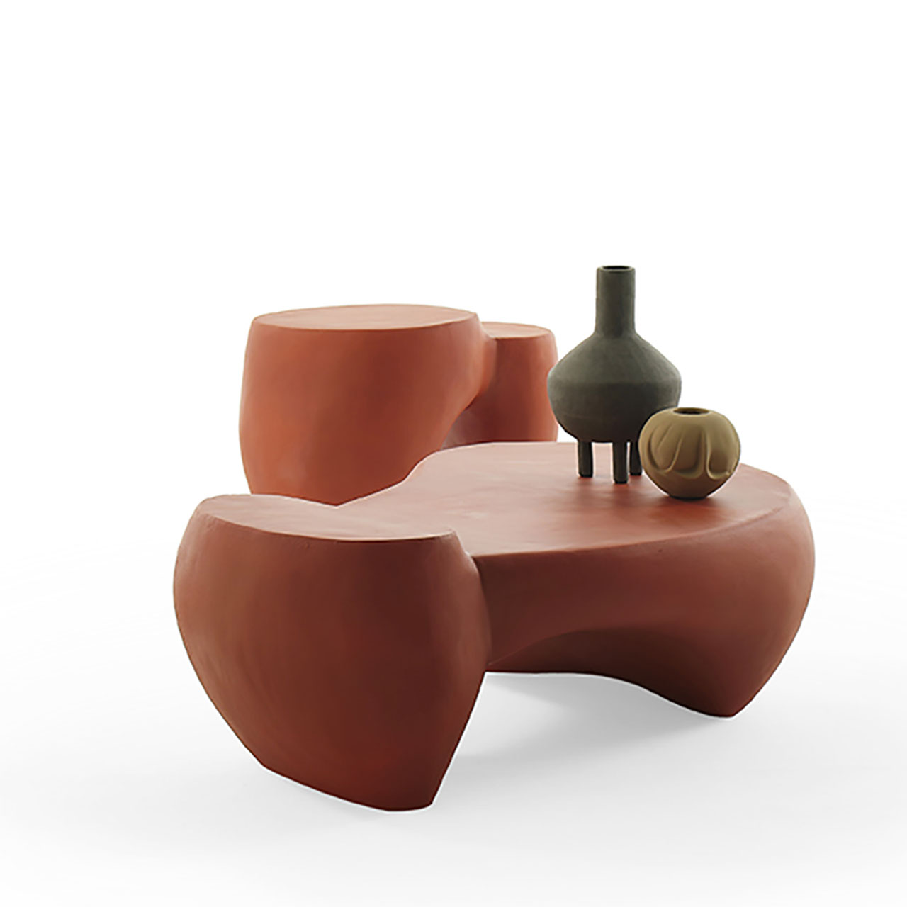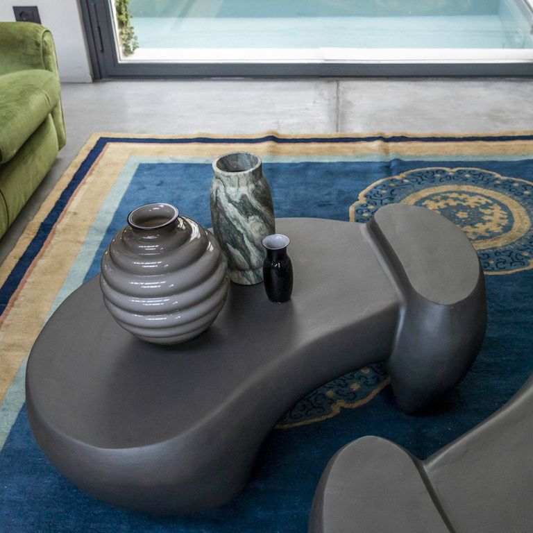 Stoneware coffee tables available in the colors: ivory, anthracite or brick. Organic shapes, like a natural landscape, appear to be constantly changing depending on how the light illuminates them.