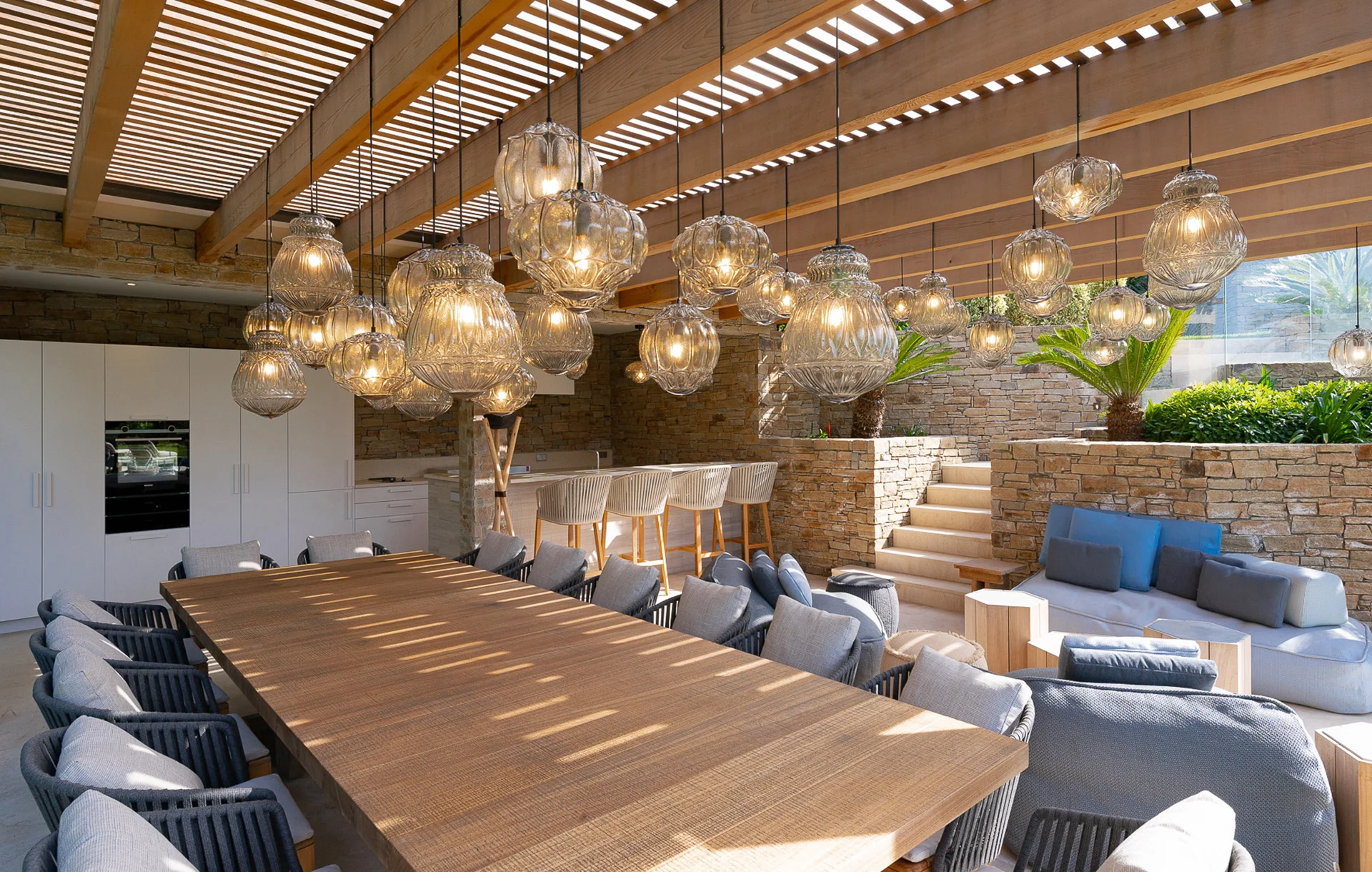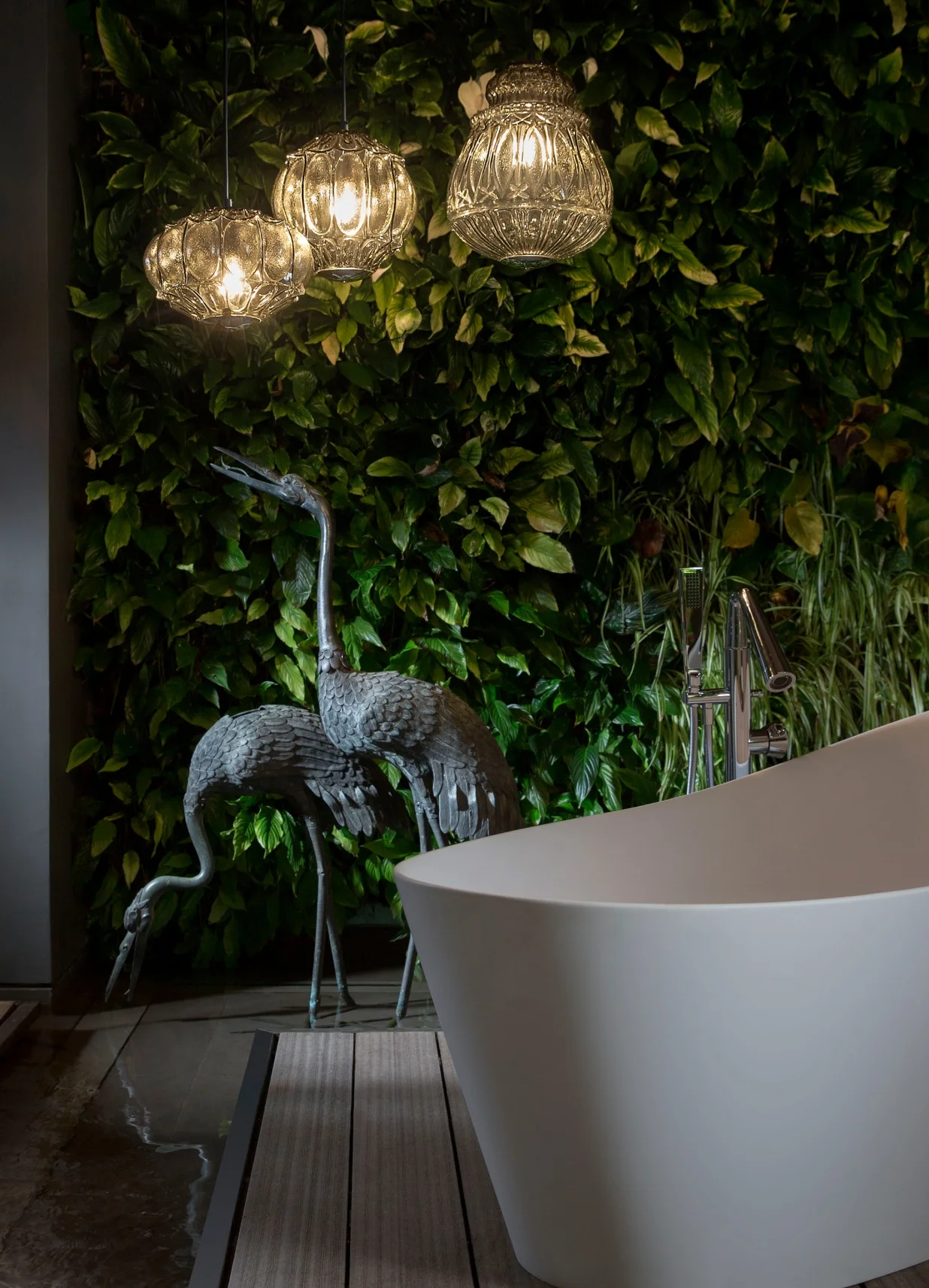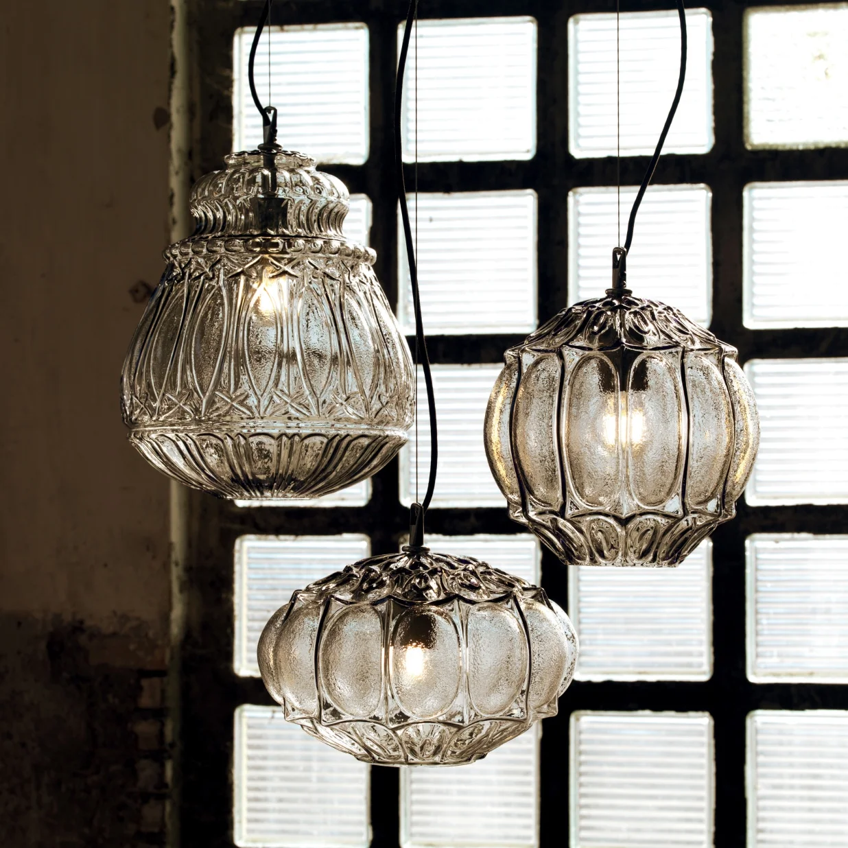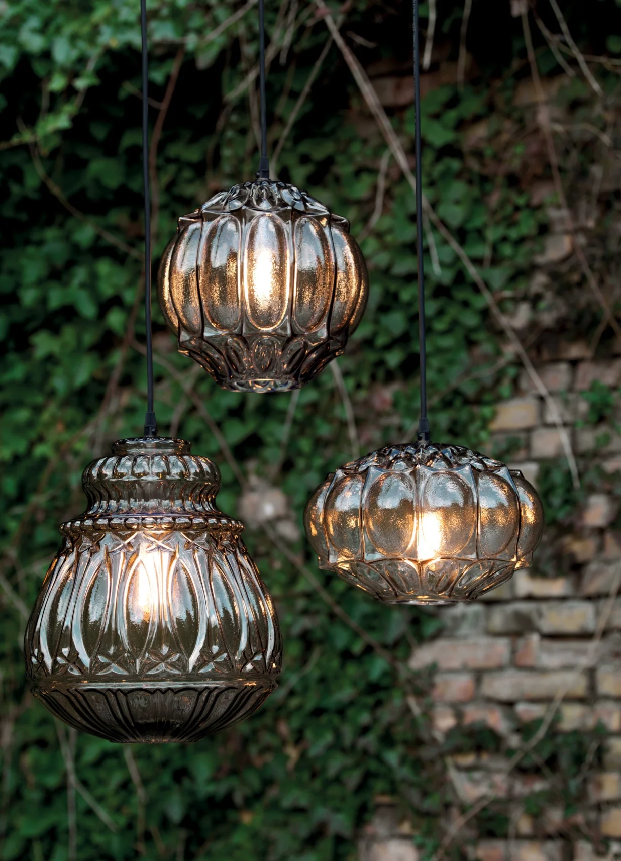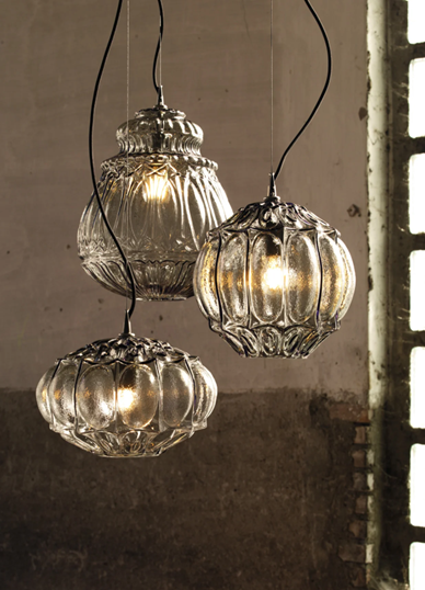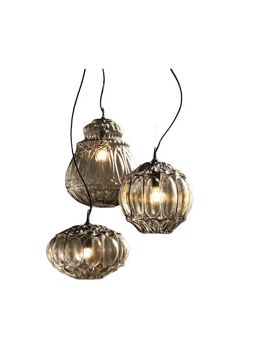 Three rounded shapes with a retro charm, suspensions of smoked or straw yellow coated glass. The interior of them is covered with vitrified decoration that lets light spread and take on a new look. Designed using an old mold, it is available for both indoor and outdoor use.