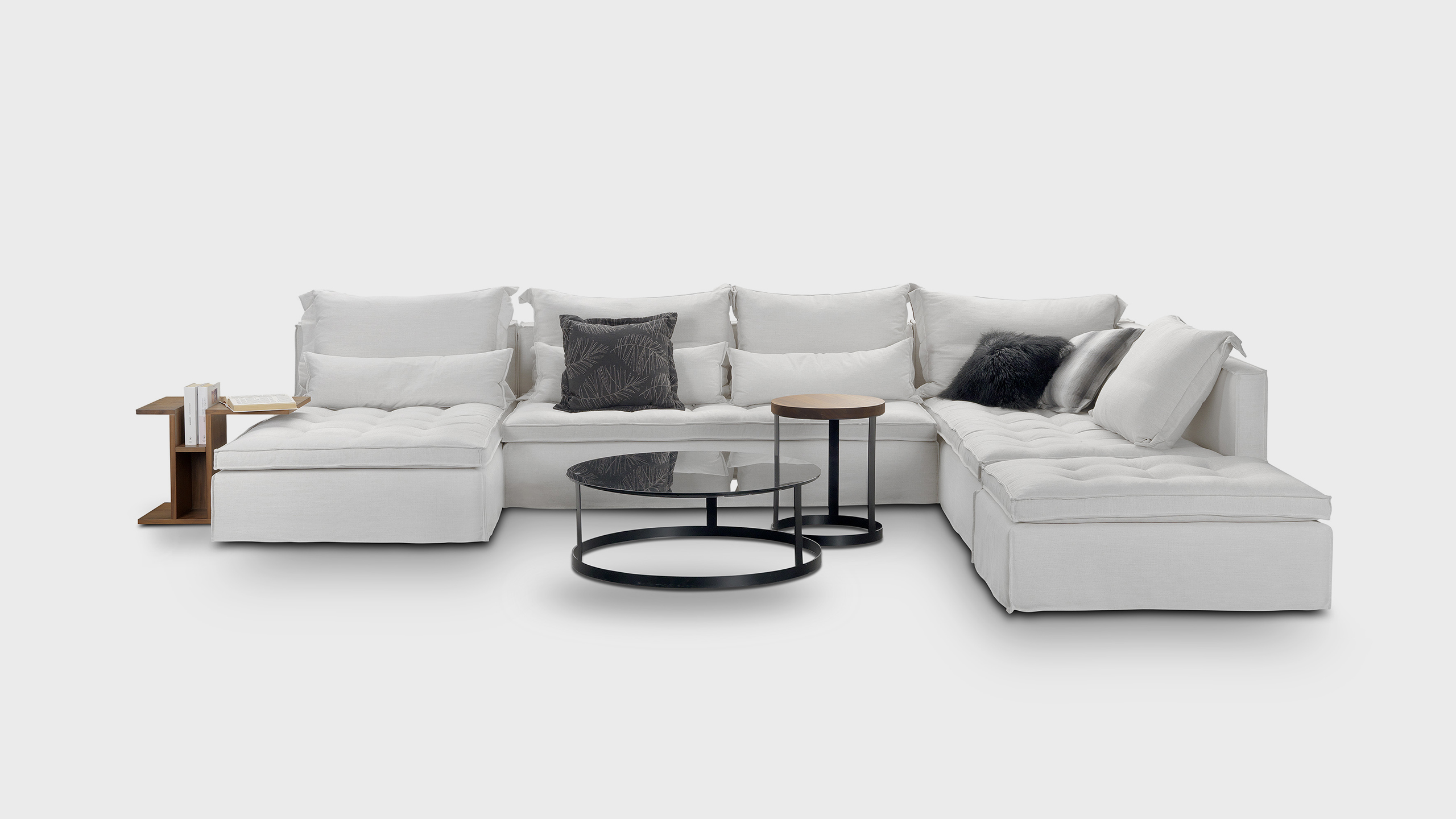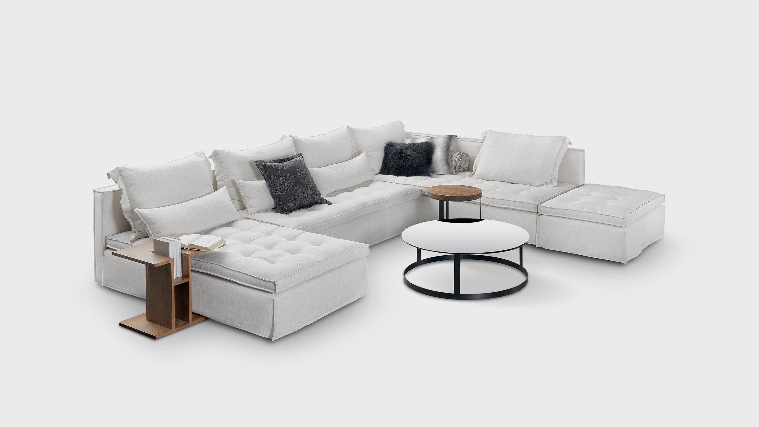 Harem seating system consists of modular units of different sizes that form a variety of combinations. The units are well attached to each other by efficient metal connectors. Harem series is characterized by slim backs and arms as well as a double system of backrest cushions that embrace the waist. It is available in a variety of fabrics and colors. The covers of the sofa are removable for cleaning.