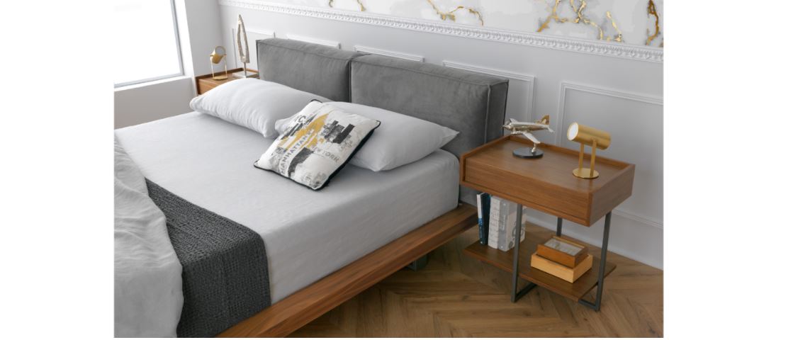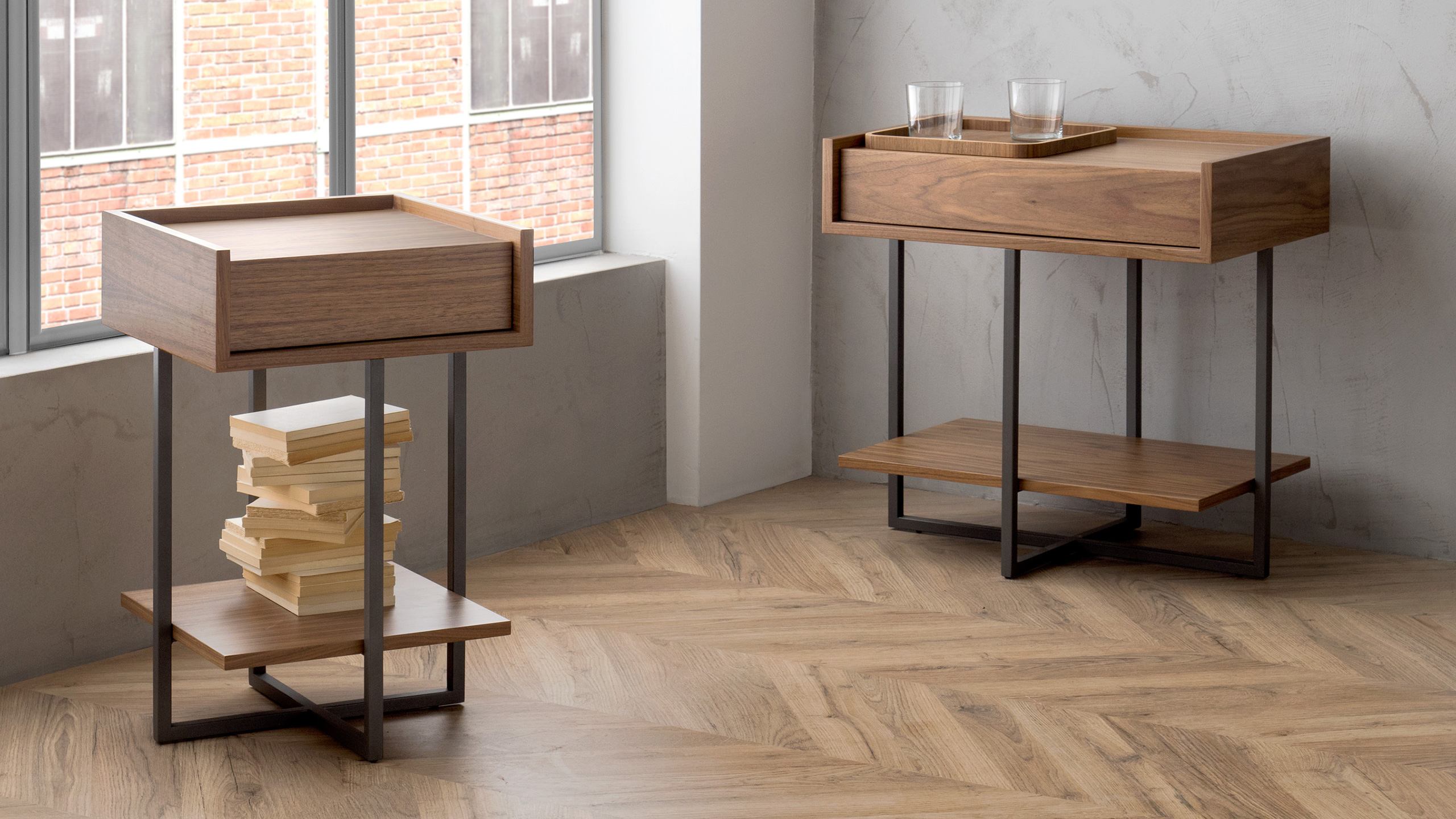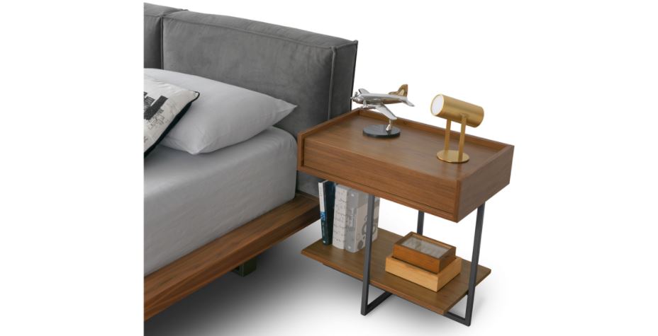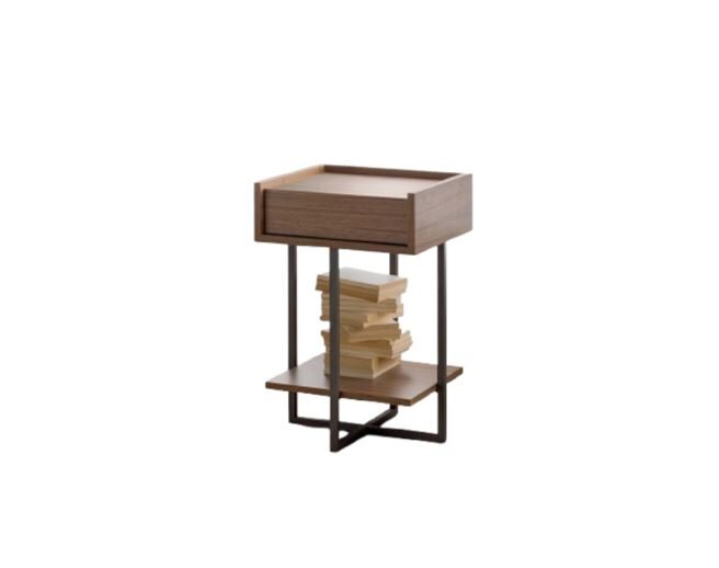 Night table with wooden drawer & metal base in various colours. Available in walnut or oak. Dimensions (in cm): 38x38xH60 & 60x38xH60.