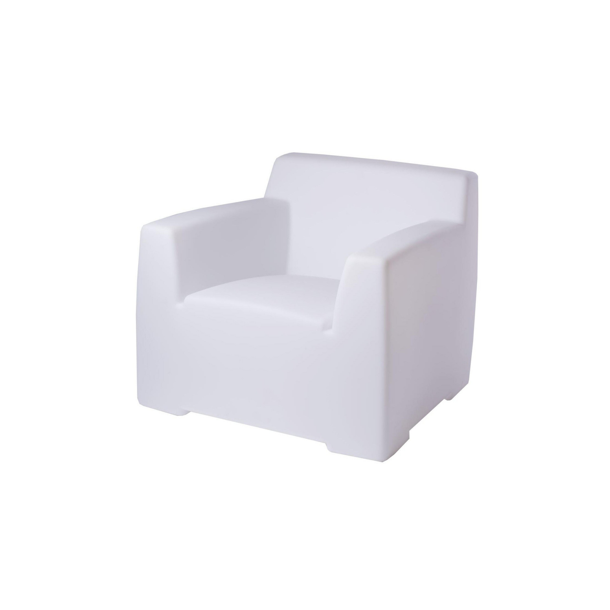 The Inout 101L armchair, defined by squared shapes, is made of white opal polyethene: it can light up as if by magic and give summer nights a touch of enchantment. It is also available with removable upholstery with sew/cut finish, for a version with softer lines.
