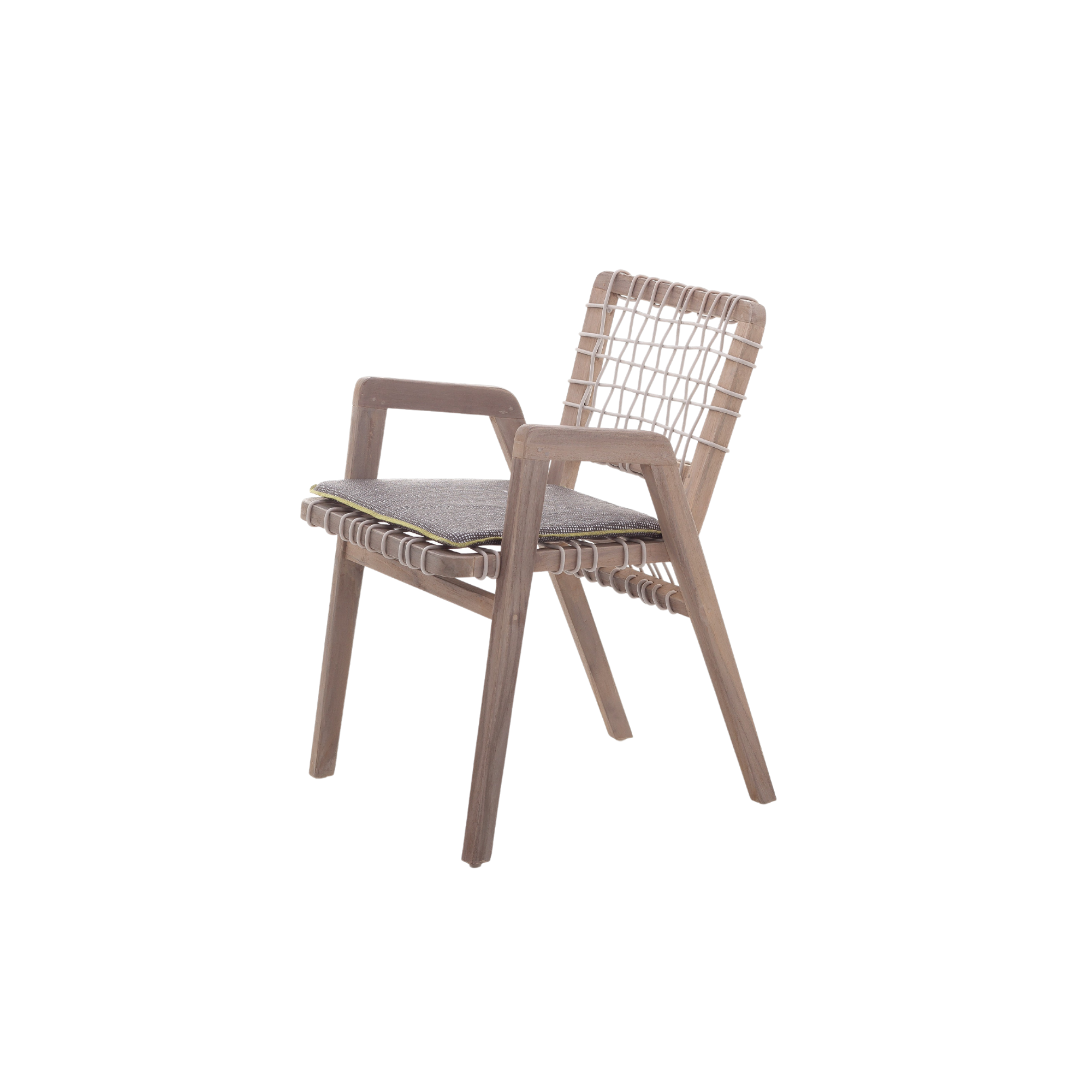 The refined Nordic minimalism defines the Inout 865/866 family of chairs with and without armrests. Characterised by backrests in two heights, they have a structure in Washed Teak, one of the finest tropical woods subjected to ageing treatment that determines the particular shade of grey of the surface, giving the products a delicate charm. This is combined with a particular mesh weave in high-intensity polyethene rope, which gives the product a handcrafted charm.