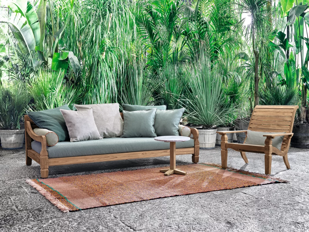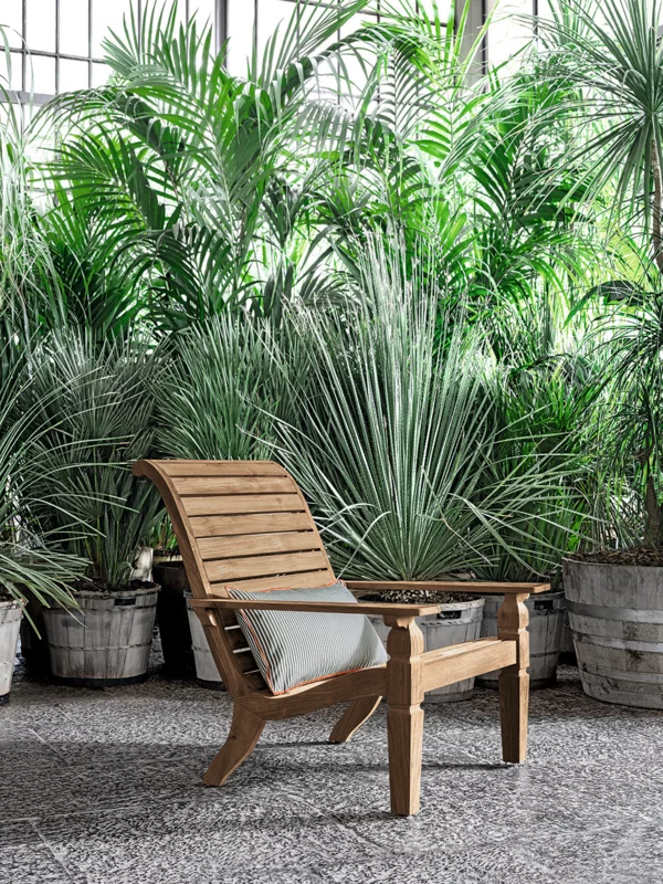Armchair in colonial style of exotic inspiration, Jeko 26 has a structure made of ECOTeak, a material coming from the reuse of recovered beams and teak elements that have been repaired with recycled wood, assembled and polished to highlight the original veins. Lumbar cushion 60×30 cm with removable cover.