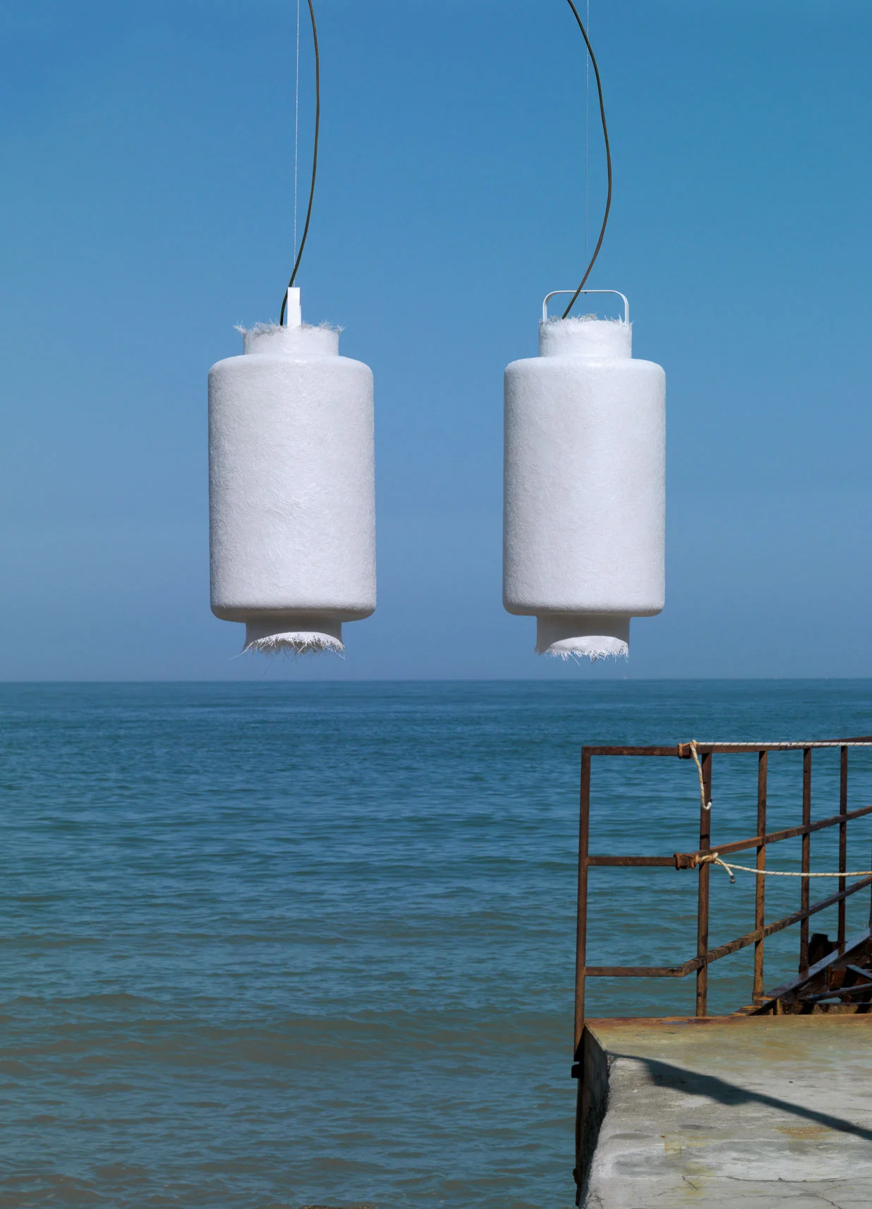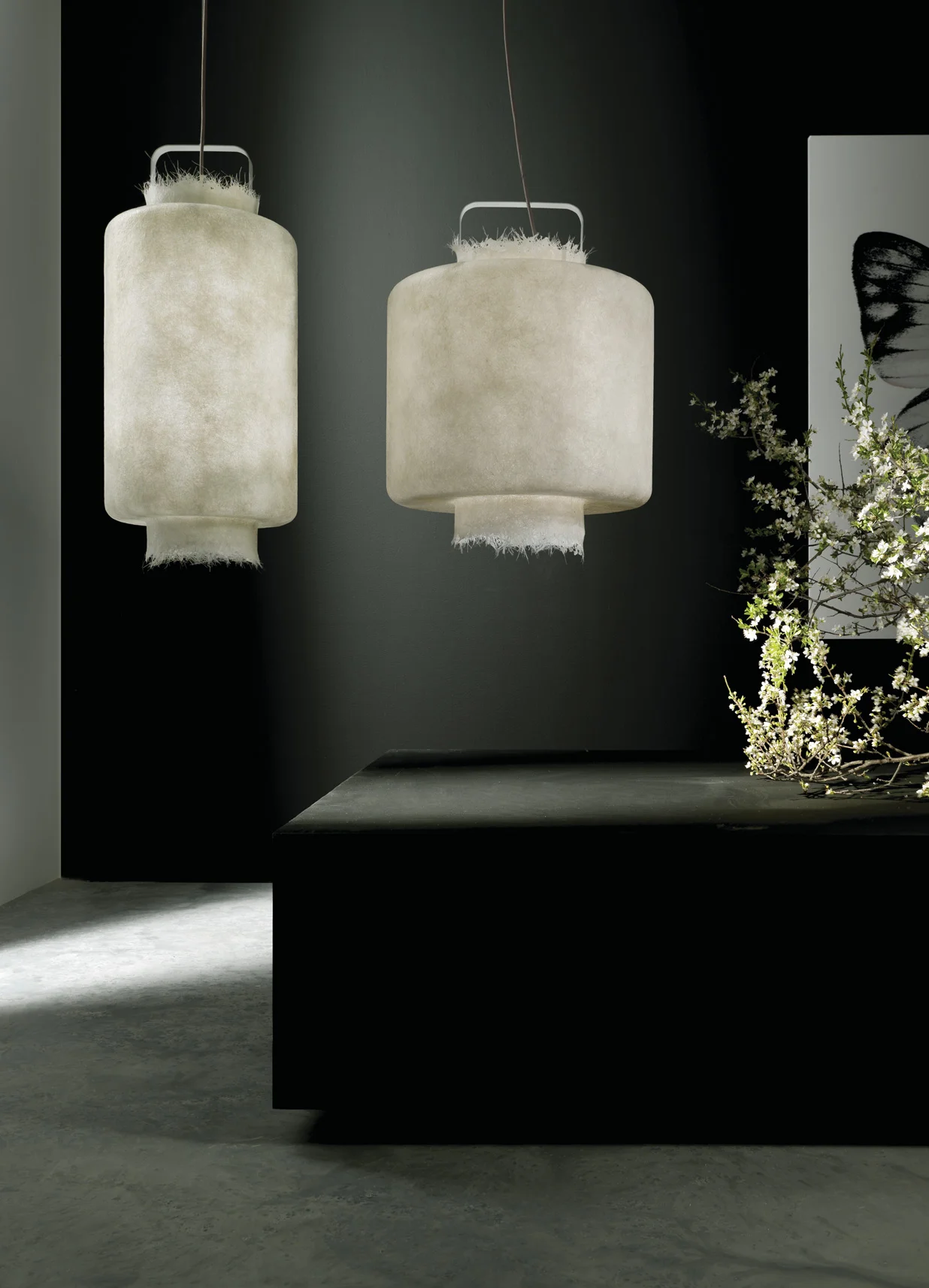 With its simple yet striking transarency, Kimono is a pendant lamp inspired by Japanese lantern. Made of white fiberglass, it is available in two shapes and sizes for indoor and outdoor use.