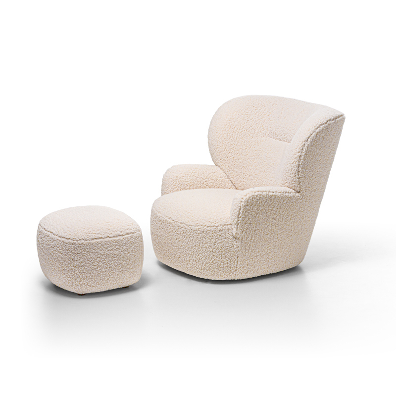 Product with an important shape, it has an enveloping structure whose particularity is found in the proportions between the seat and the backrest: the latter surrounds the seat padded with high-density polyurethane foam in different densities like a nest. The LOLL 09 armchair with solid wood structure with springing by elastic belts with a high rubber component, is characterised by a removable cover and is further embellished by the swivel base with return mechanism.