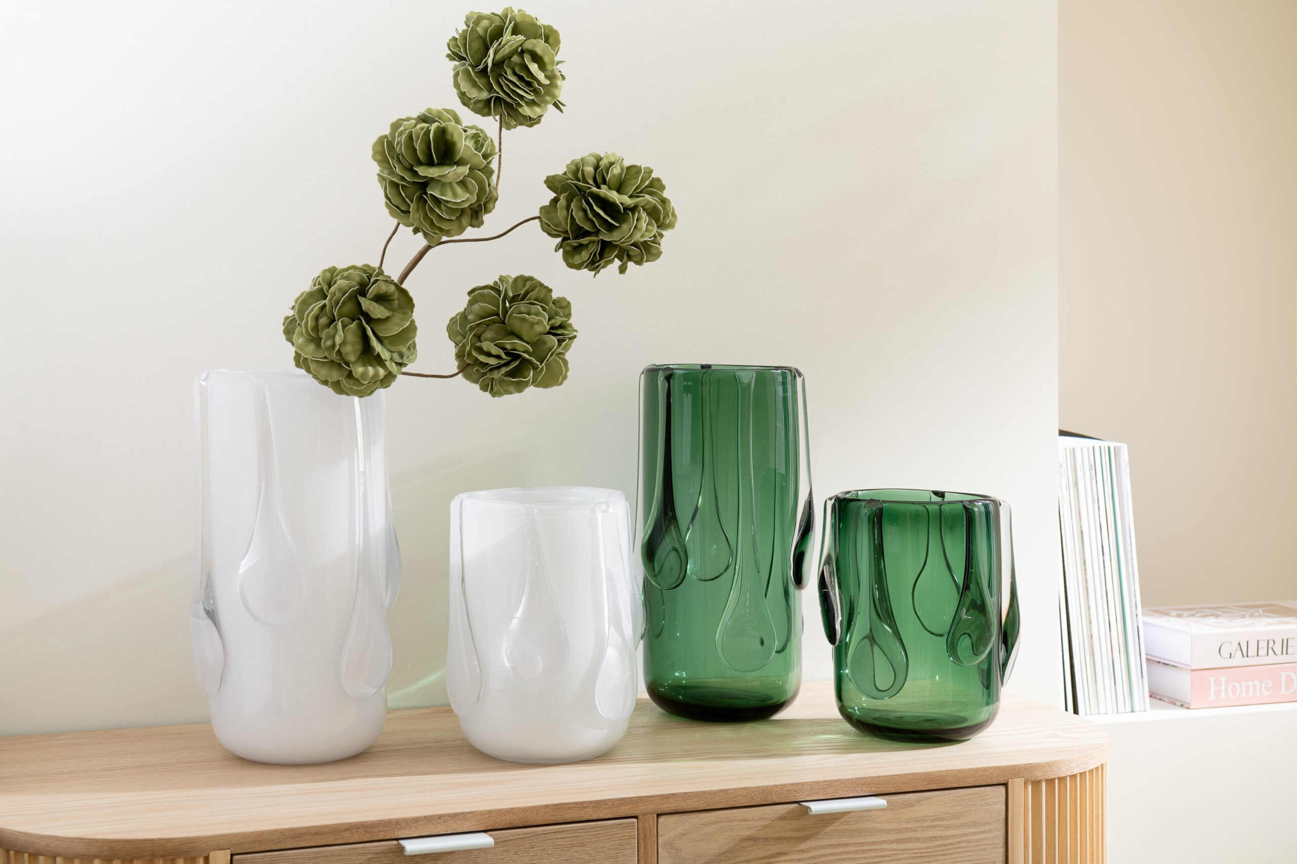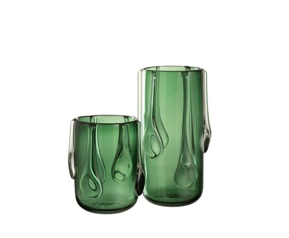 Available in two sizes—L19 × B19 × H22 cm or L18 × B18 × H33 cm—these green glass vases feature charming decorative drops. Ideal for flowers or as standalone accent pieces to brighten any space.