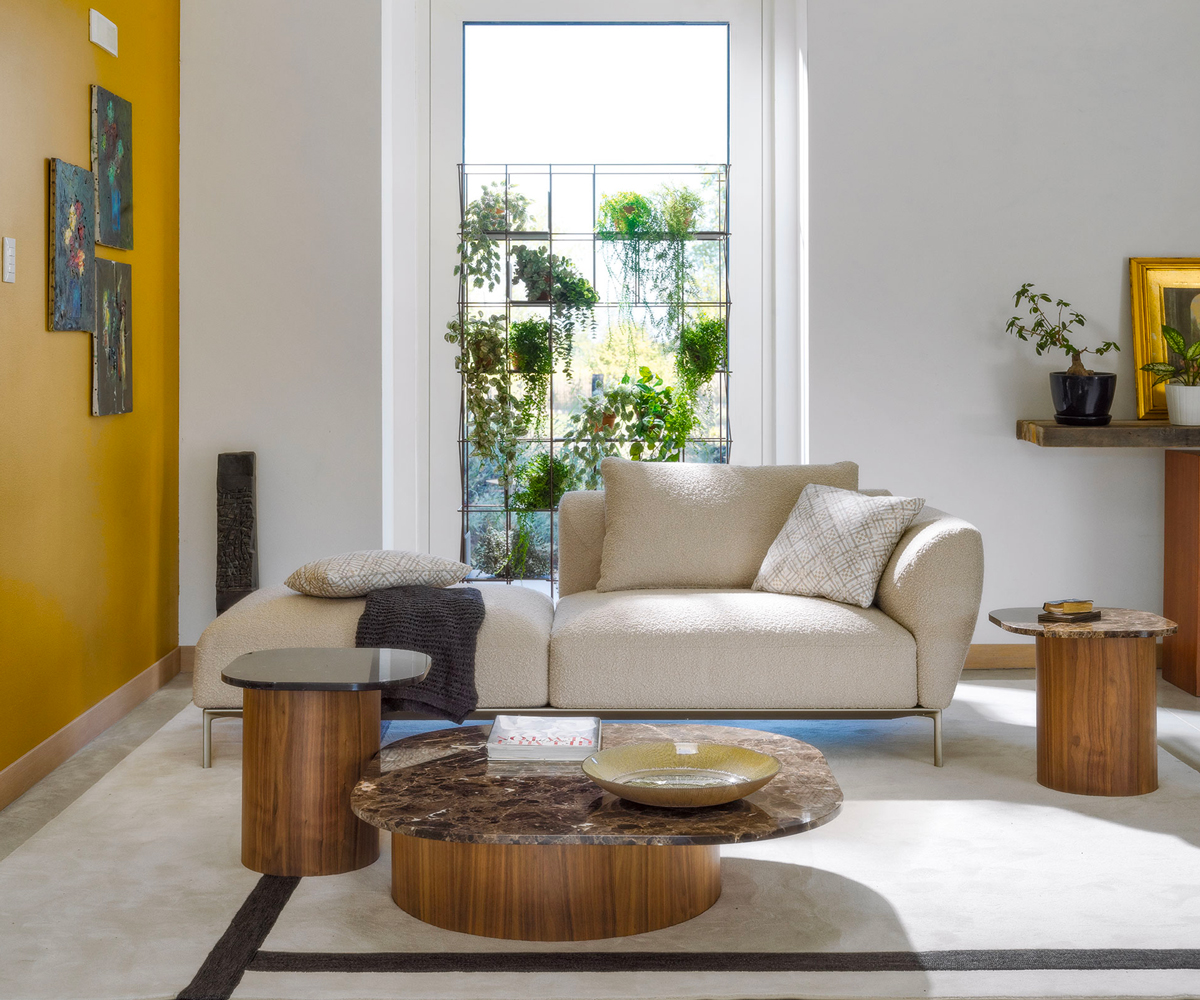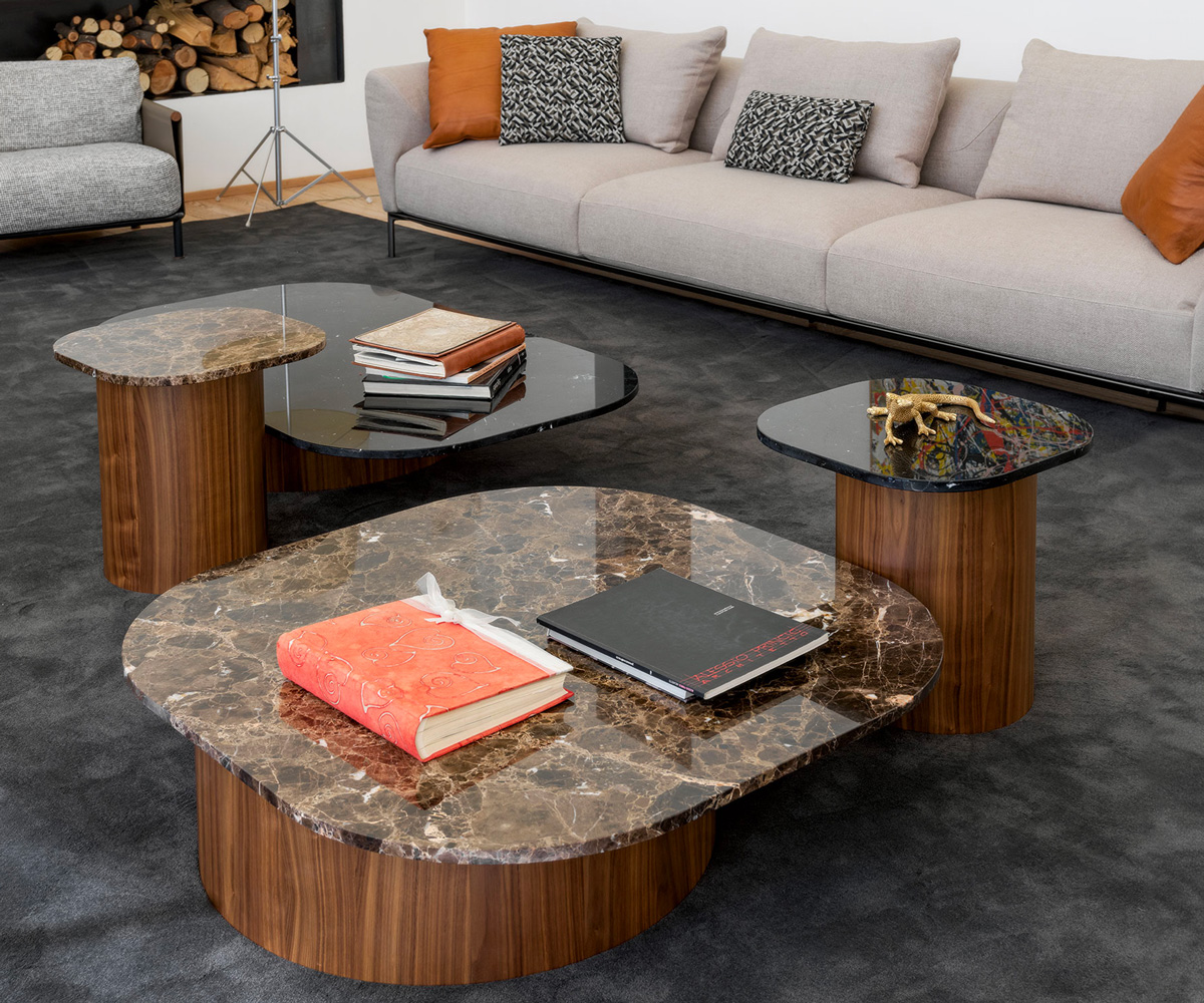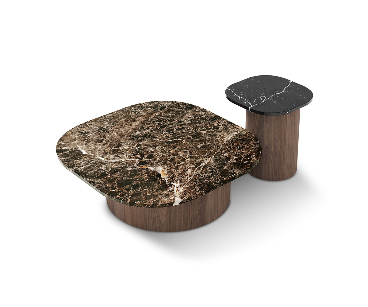 Marina is a family of tables and coffee tables whose essence lies in the harmonious disproportion between cylindrical walnut legs and a strict marble top. The Marina collection synthesizes the traditional lines of the table into a few strokes, eliminating unnecessary design, and using wood and marble to achieve skillful and evocative shapes.