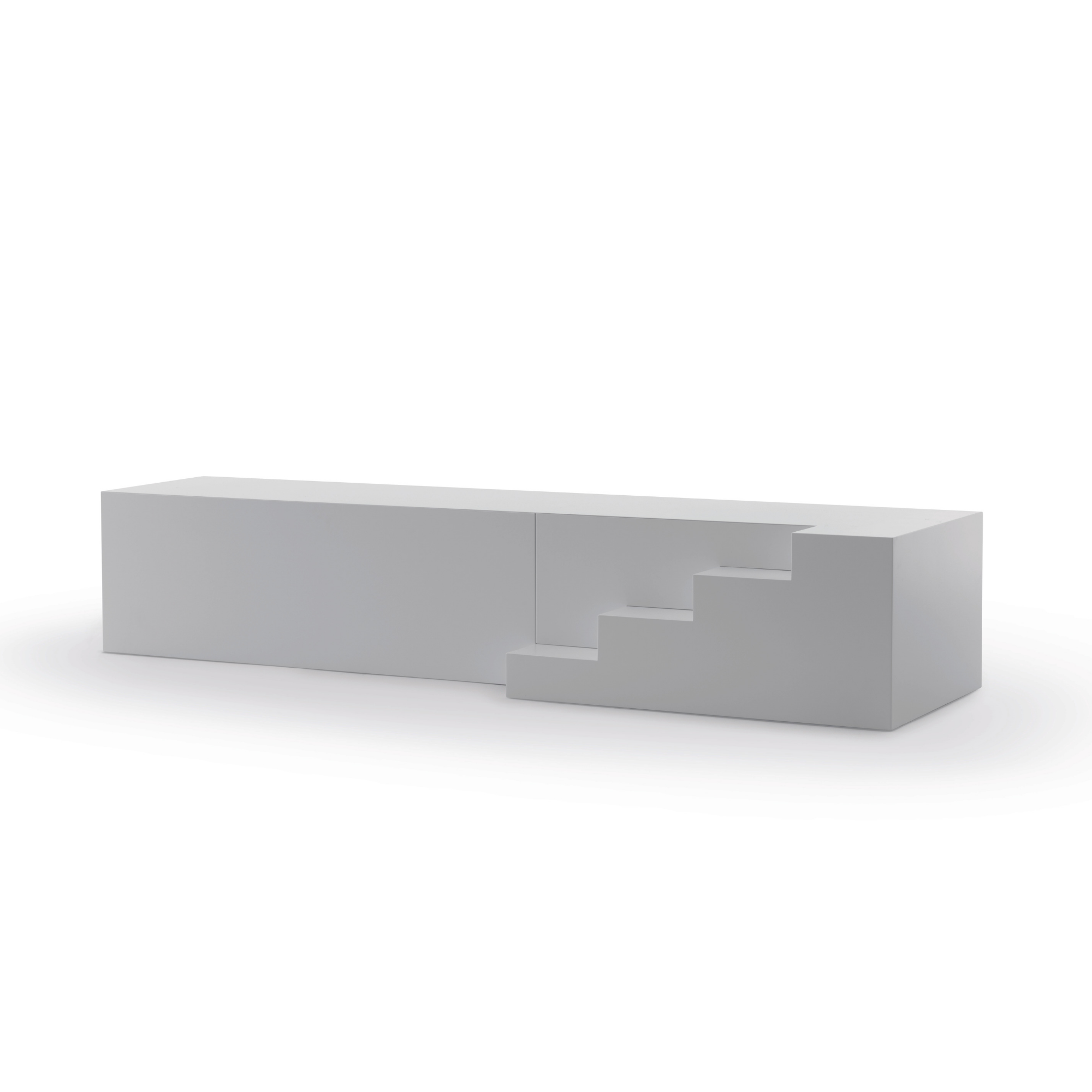 This is a monolithic sculptured table that is extremely simple and linear but with the addition of an element that moderates the austerity and rigid quality of the object: it is a series of steps that direct one`s attention to the world of architecture by calling to mind the stairs of buildings and monuments and the steps leading to the door of a house. The ladder becomes a functional part and is useful for magazines, small objects, vases, etc. and also a conceptual part that metaphorically goes from one world to another, from one space to another, from a chaotic outside environment to one that is calm and domestic on the inside.