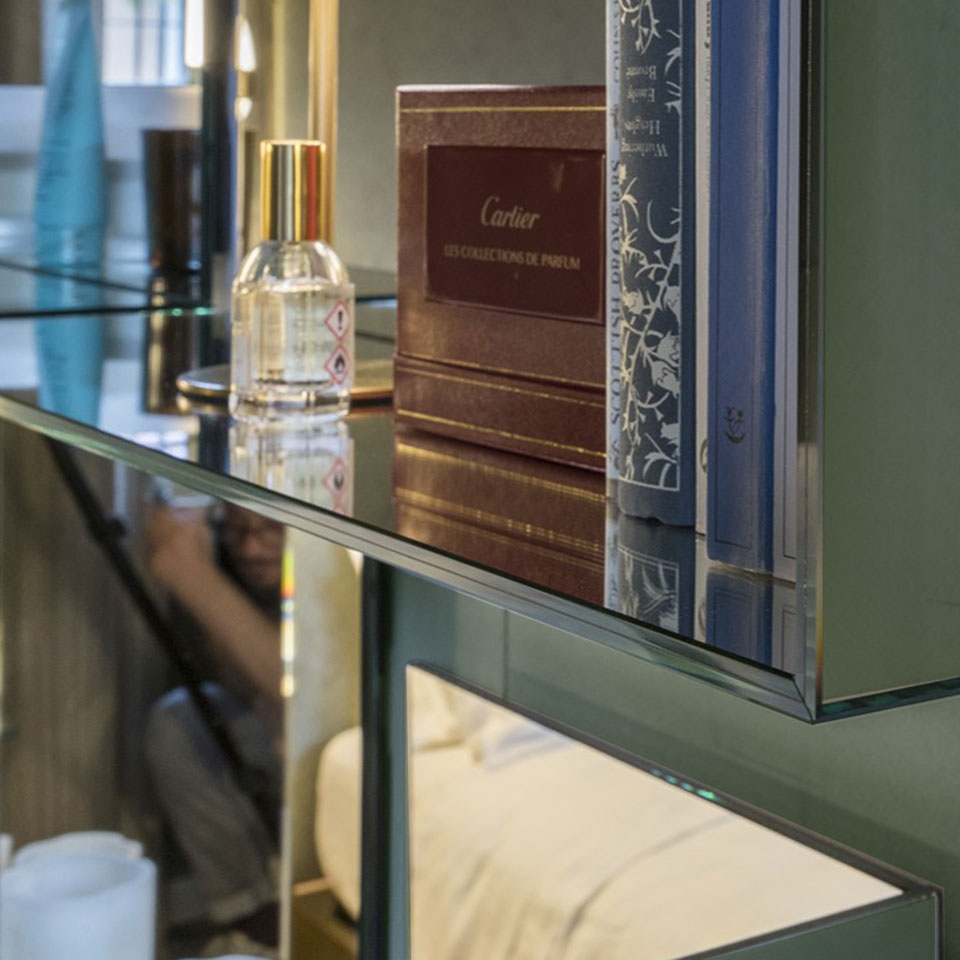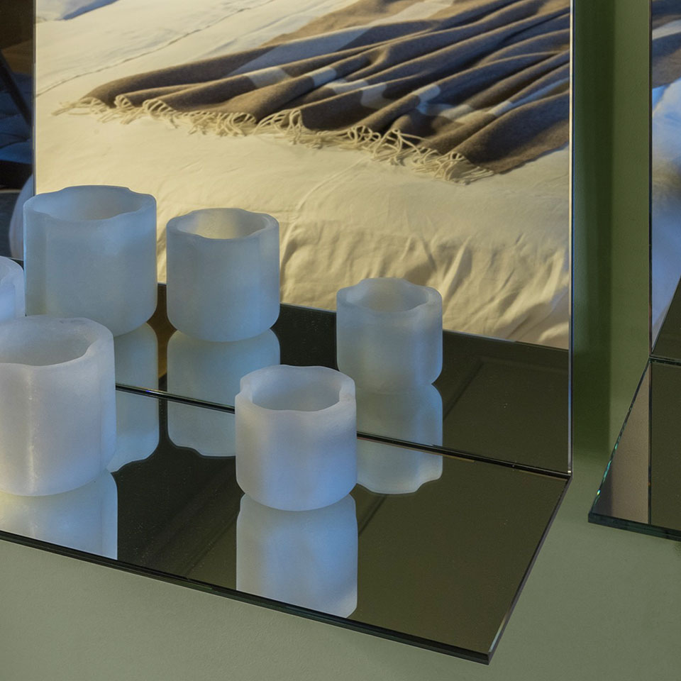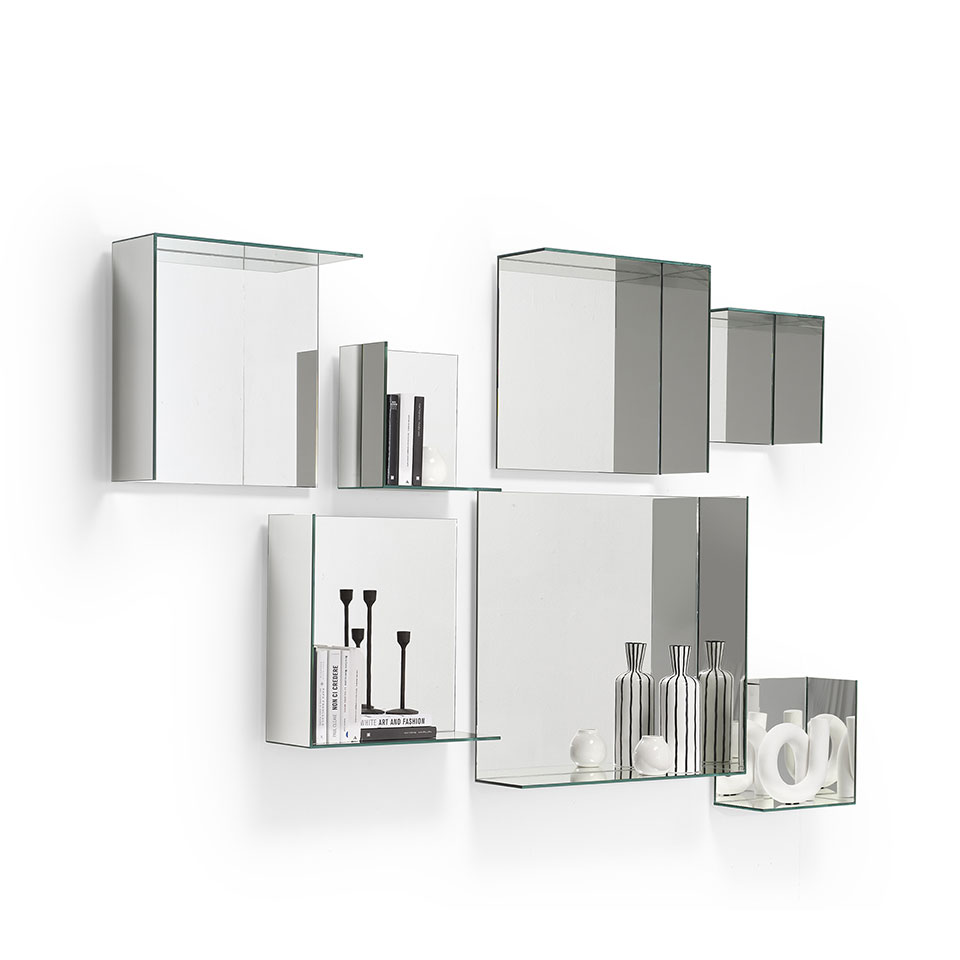 Narciso is a square mirror composed of simple reflective surfaces and real spatial volumes. Completely mirrored, it captures the surrounding space, multiplies it infinitely and creates unexpected perspective games where reality merges with illusion. Designed to accommodate objects, they transform the mirror into a practical and versatile furnishing element.