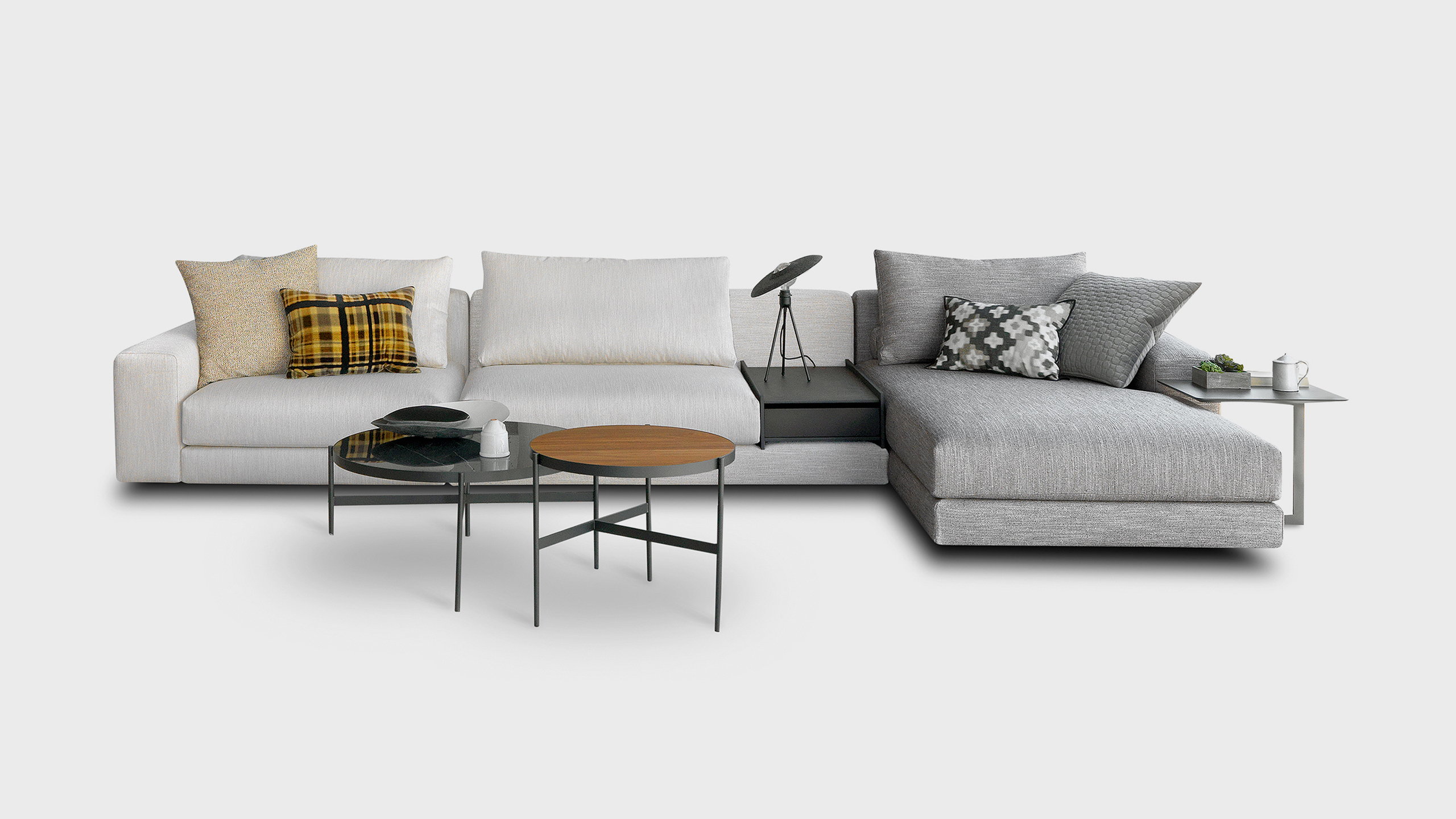 They are available as standalone coffee/side tables or in a cluster, favoring the combination of materials and colours.