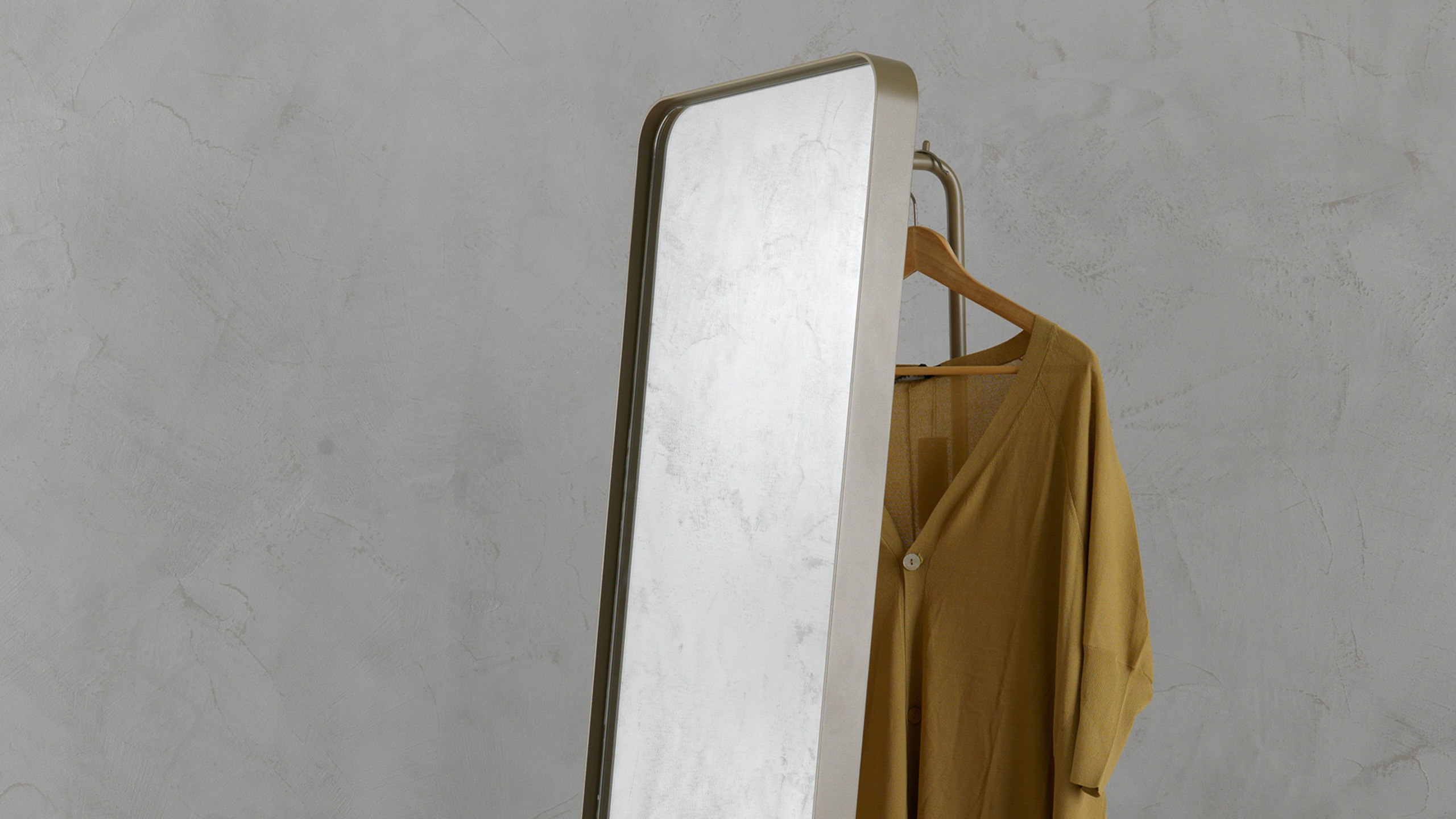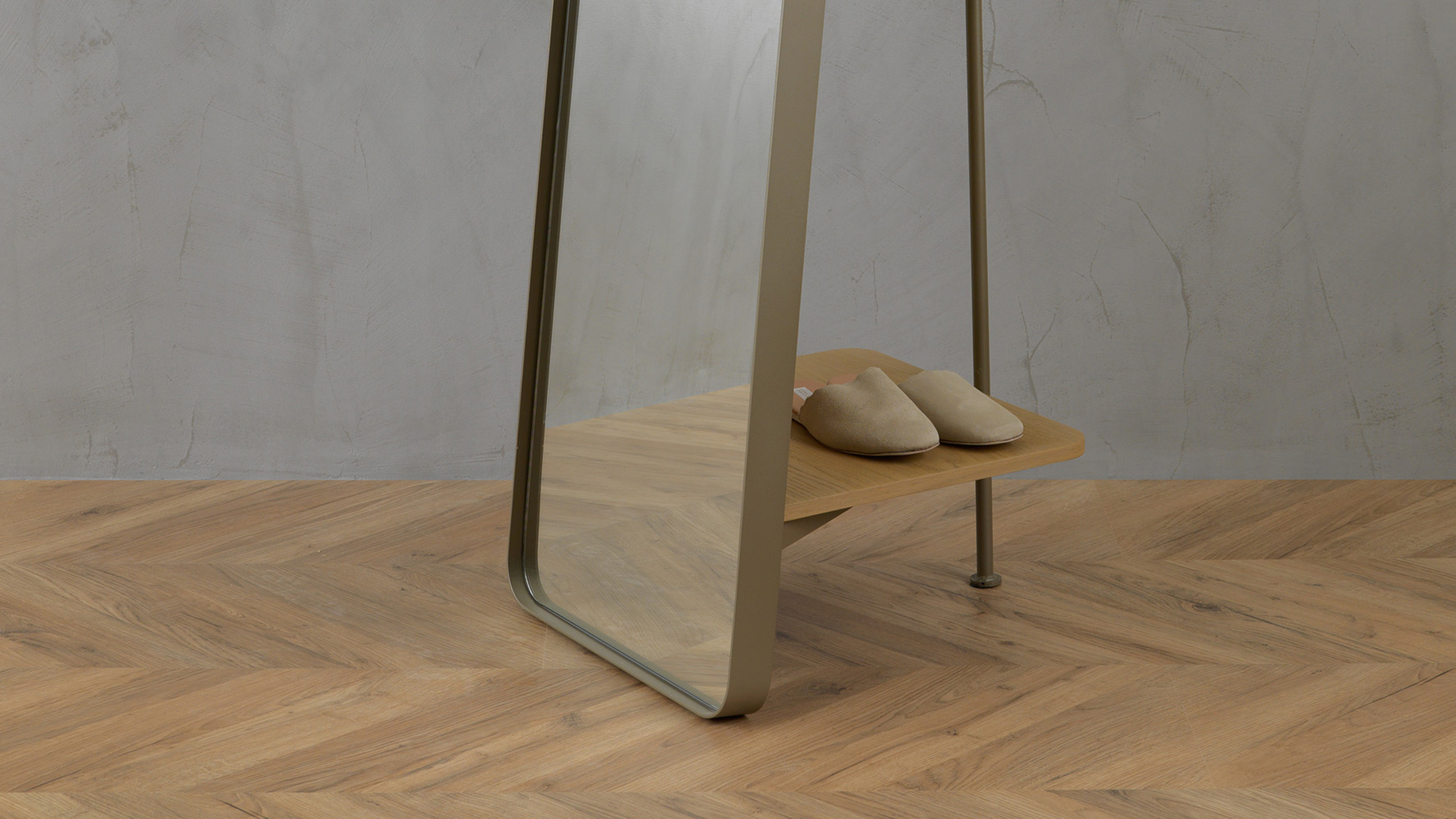 Nexus series floor mirror. Available in metal and oak in various colours. Dimensions (in cm): 46x45xH180