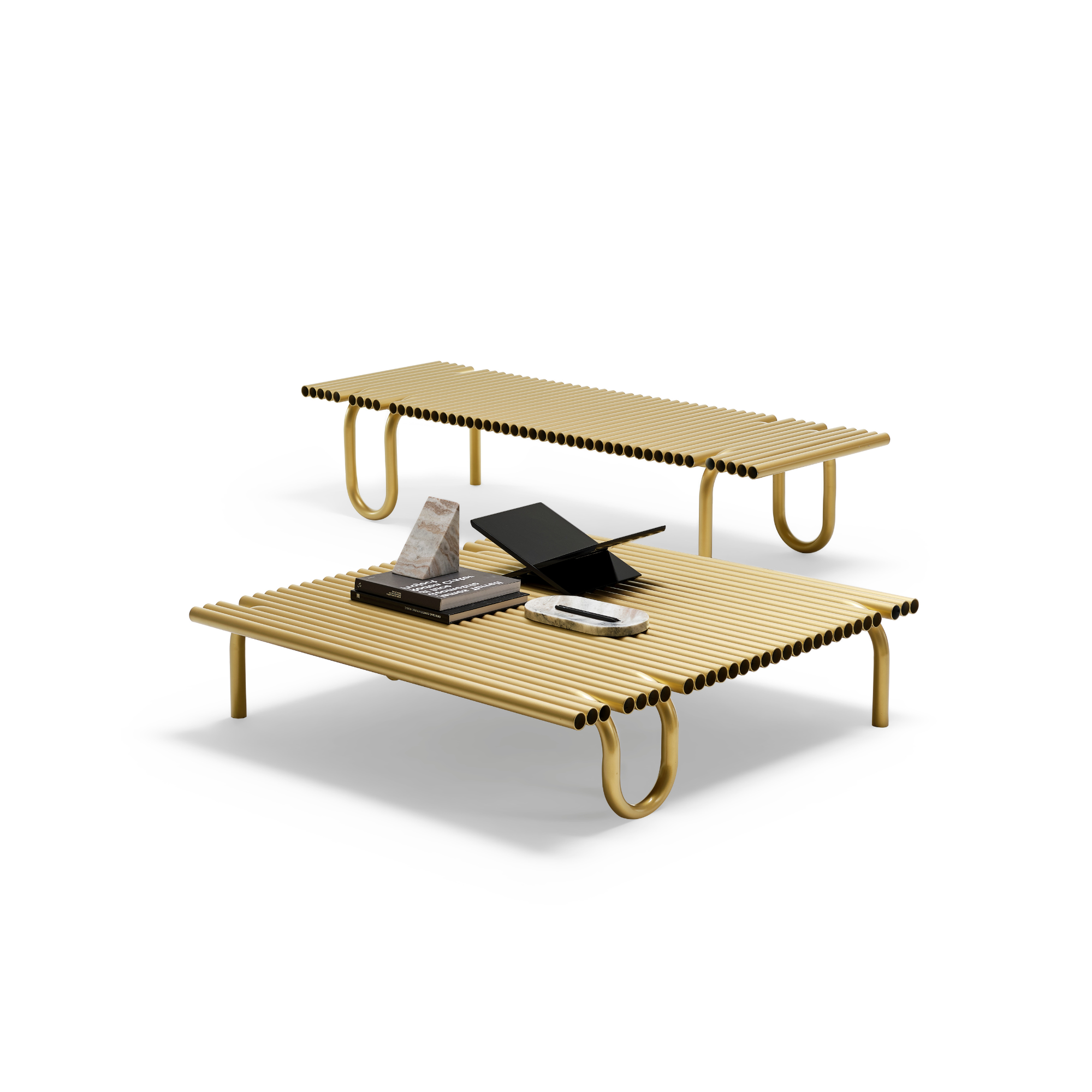 Metal coffee tables and consoles characterized by a strong graphic sign and a strong personality. Essential lines and well-known geometries. The surfaces created through the repetitive rhythm of the metal tubes create lightness and solidity at the same time. Together with the console to be fixed to the wall, the square and rectangular coffee tables furnish with elegance.