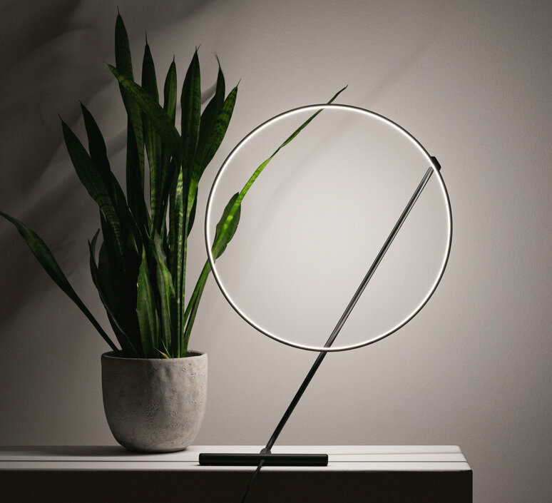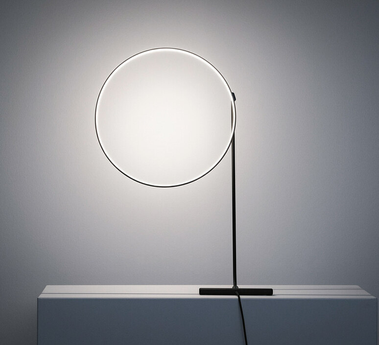 A circle of light and a metal rod. Slender, lightweight and adjustable up to 320 degrees, they can be moved as one to create ever-changing configurations. The solid T-shaped base acts as a counterweight. The rod is placed at a tangent to the circle, in acrobatic or static poses. An invitation for two-way interaction with the light.