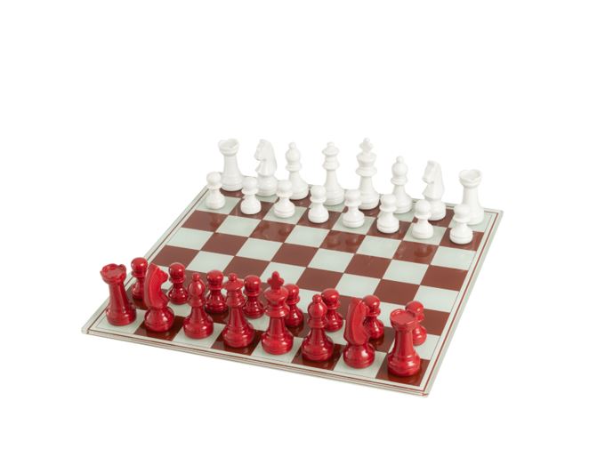 An exquisite red and white chess set, crafted to embody sophistication and timeless elegance. With its bold color contrast and refined design, it serves as both a captivating centerpiece and a statement of luxury for discerning players and collectors alike.