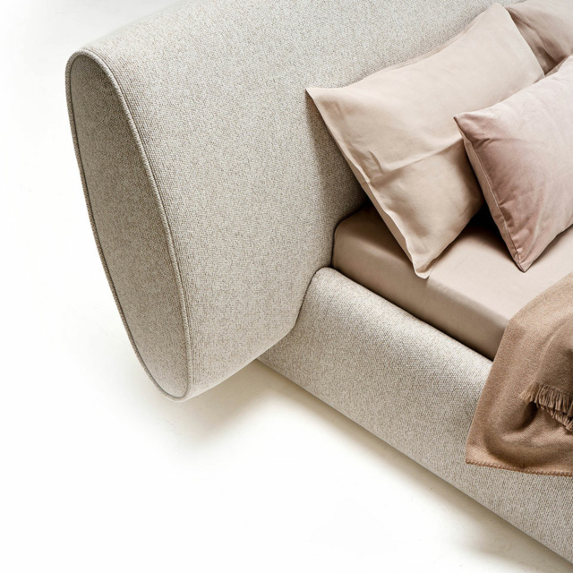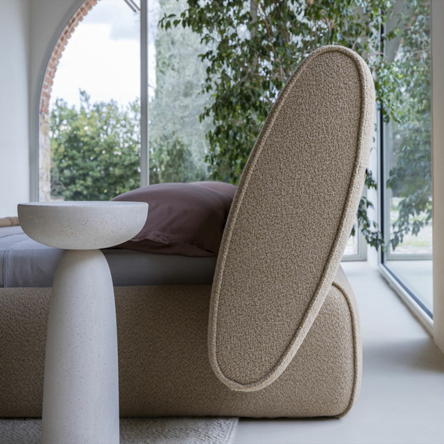 Sculptural and architectural padded double bed where the base seems to be sculpted to support the headboard which, thanks to its inclination, offers an ergonomic position for reading comfortably.