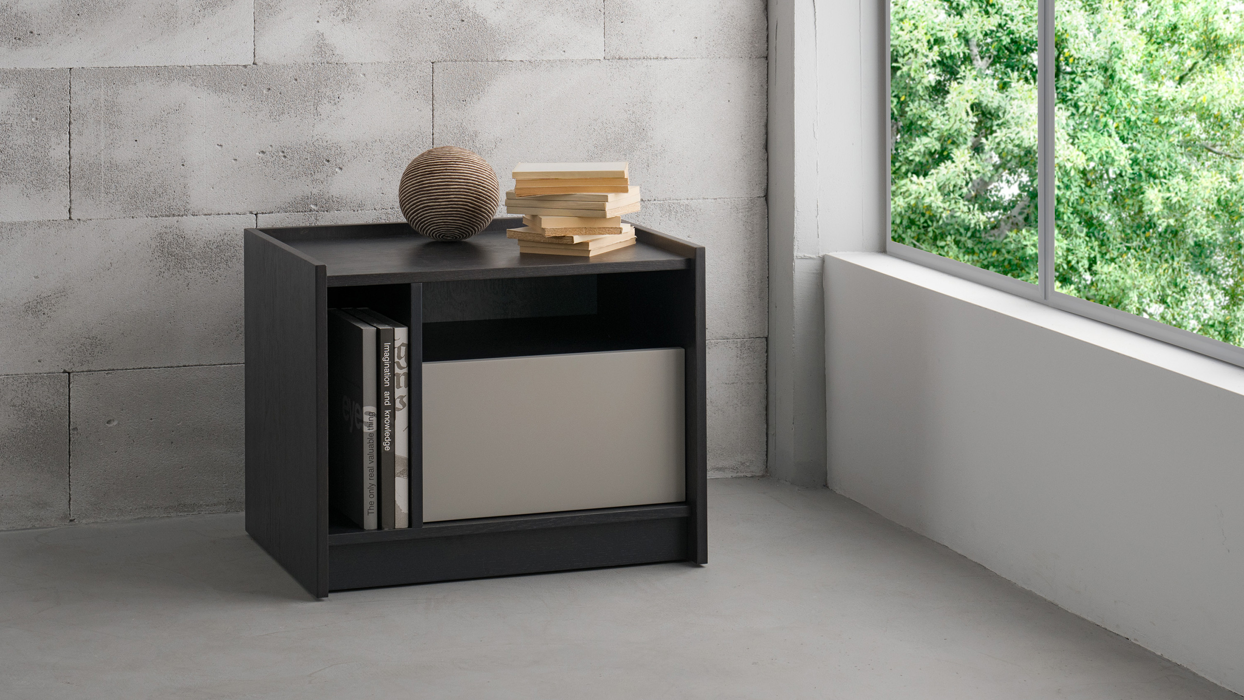 Night table with a storage area, made by combinations of wood (walnut or oak with lacquer, in various colours).