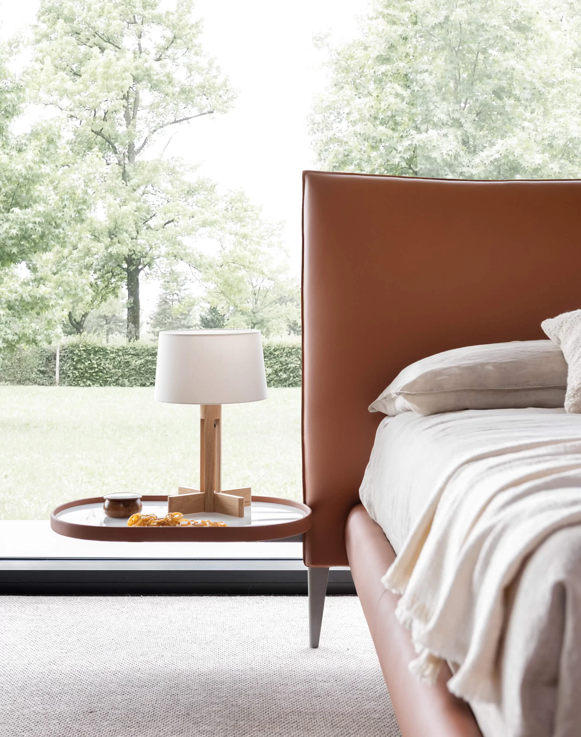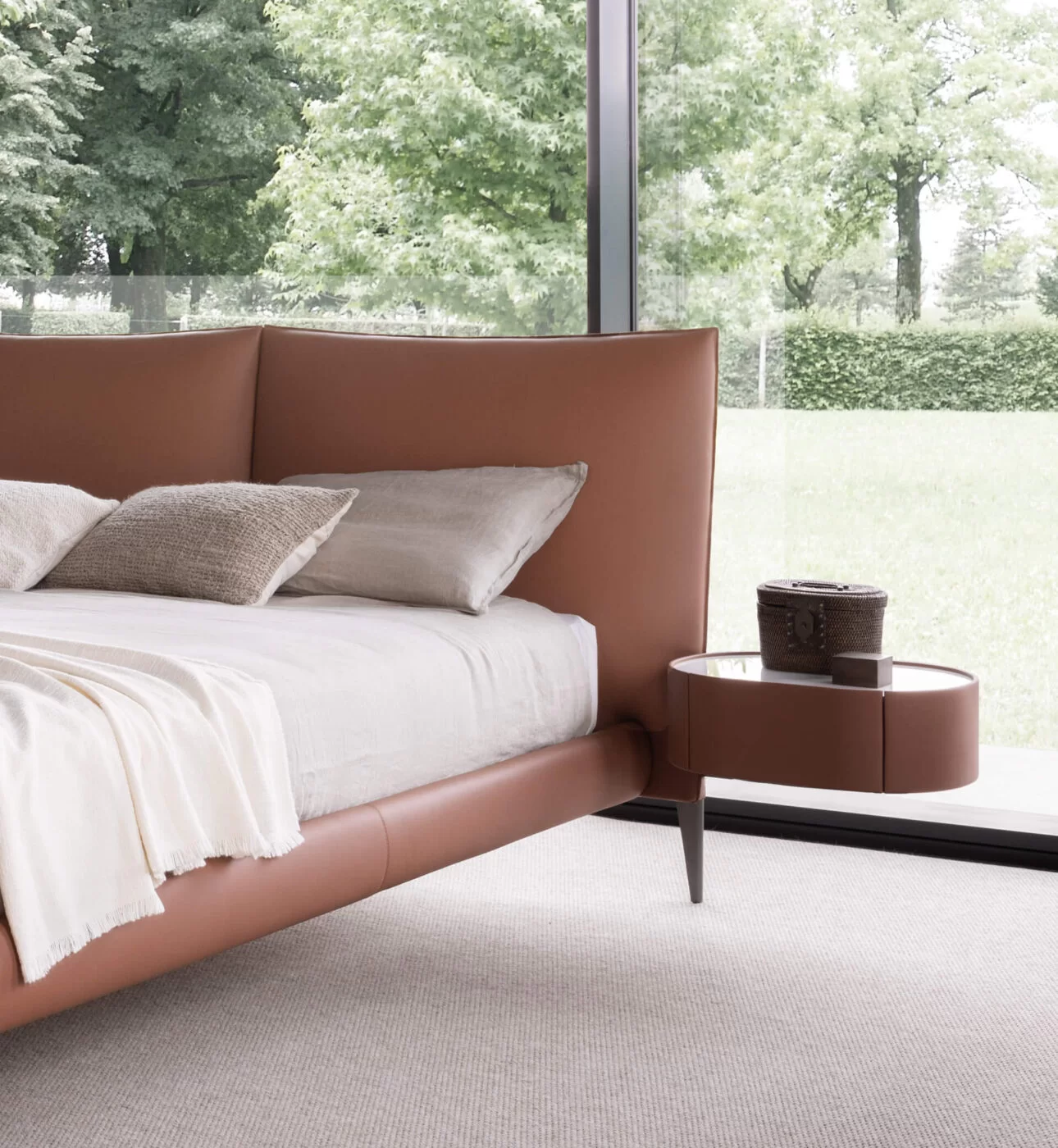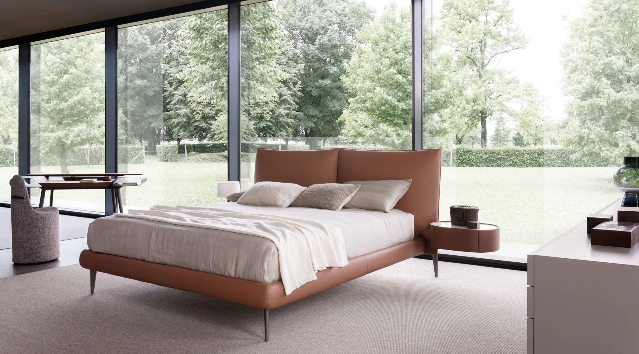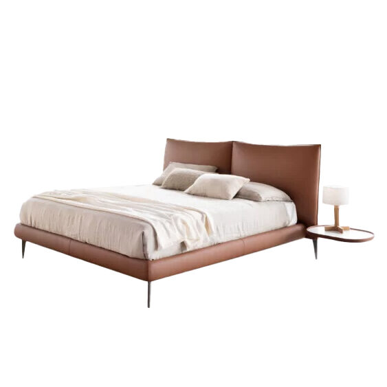 Upholstered double bed featuring a solid internal structure in metal and wood, to be covered with a wide selection of fabrics and leathers, enhanced by the beauty of the stitching. The headboard is elegantly finished with two cushions that provide extra comfort in a seated position, while the obliquely cut feet, in Metal STD Pewter finish, give the structure a touch of modern lightness.