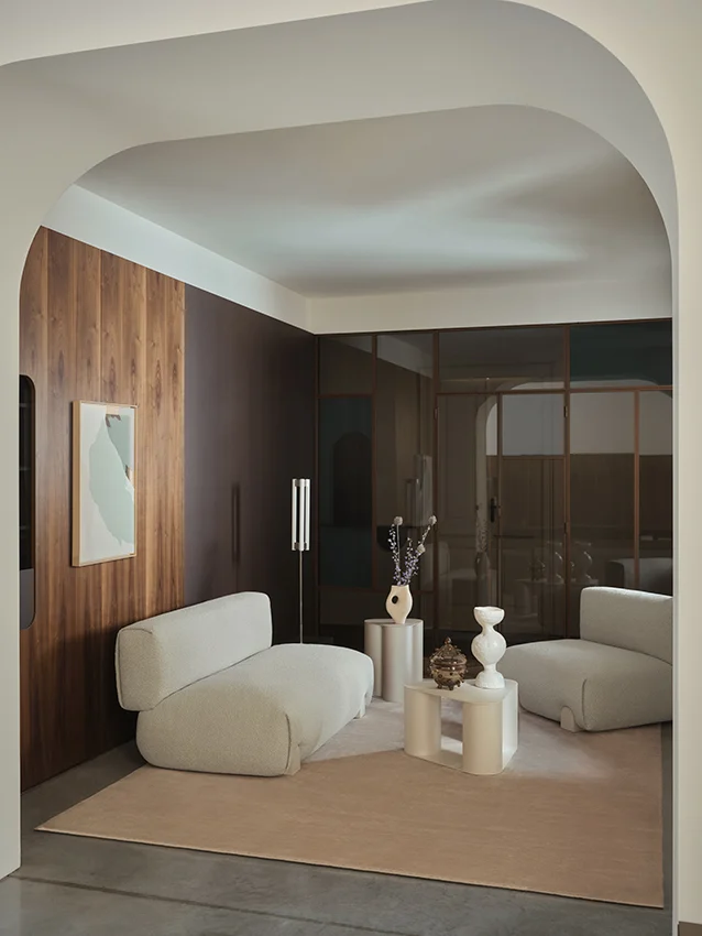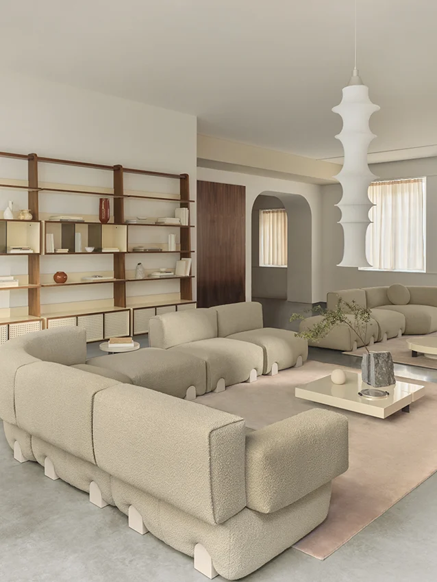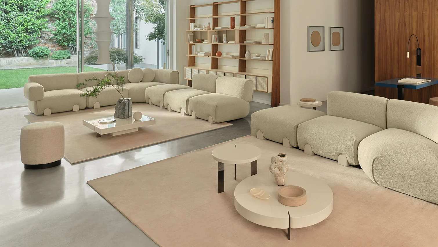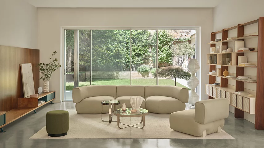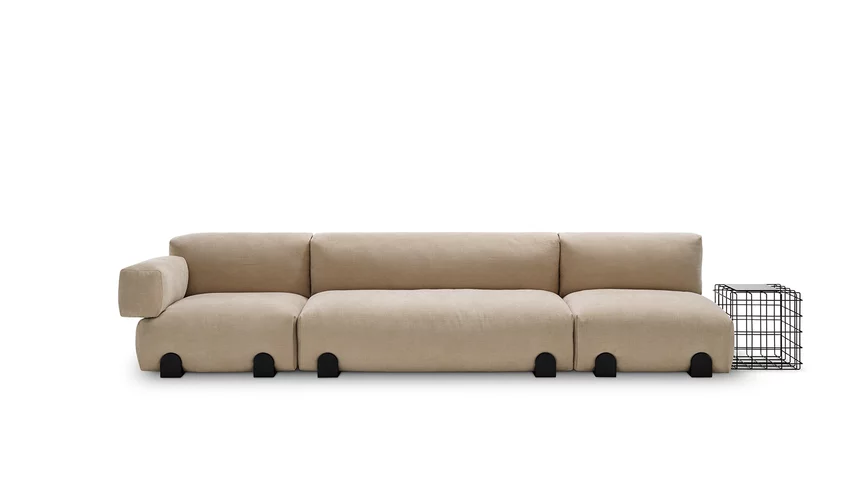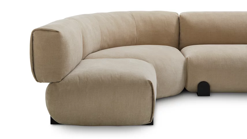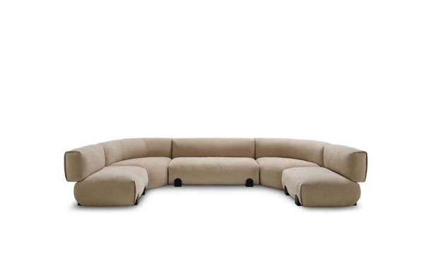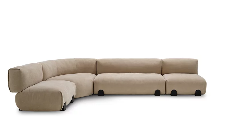 The inspiration originates from a dialogue between concepts to be intertwined together in a harmonious synthesis: simple and pure shapes sculpted in sinuous lines, yet to be perceived as timeless. The Simposio sofa, with its rounded and linear elements, becomes an ideal place of hospitality where one can converse about the mystery of beauty, creating small or large domestic arenas. Even the foot structure loses its formal function and becomes a distinctive element, designed to evoke the sensuality of a pressure point on fabric. A bold upholstery has eliminated most of the seams, only a side fold defines the profile of the elements, reminiscing a Greek peplum. The colors black, corten and sand are well suited to the fabrics of Simposio’s palette and define its original character.
