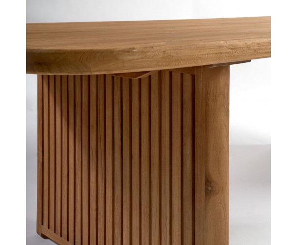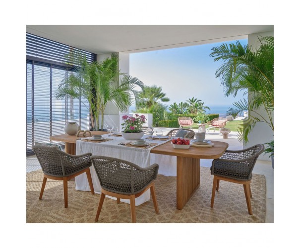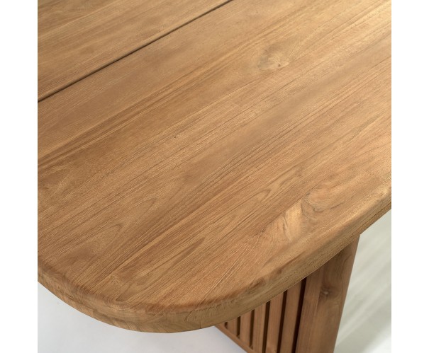 Teak wood outdoor table with two glued legs and a top with an opening is an essential piece for those looking to create a cozy and sophisticated atmosphere in their outdoor space. Made with teak wood in original color. This table not only adds beauty and style to any setting, but also offers resistance to the natural elements.